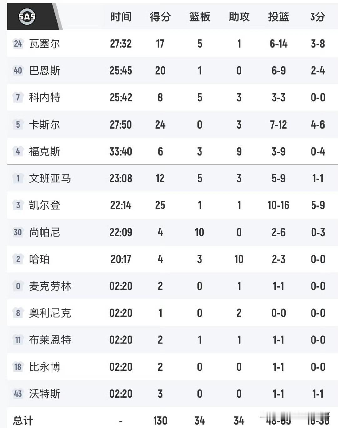 雷霆赛季第4败!!!文班亚马替补,马刺三人20+再次掀翻雷霆! 在刚刚结束的一场比赛中,马刺主场130-110大胜西部第一的雷霆队,送给对手赛季第四场败仗,雷霆创纪录是有点难了,马刺这关他们真的过不了。 马刺方面:除索汉没有登场在,其他球员都有所贡献,全队只有5人得分上双,但是卡斯尔24分、凯尔登25分、巴恩斯20分,这三个人就把马刺给虐了。 雷霆方面:亚历山大依然高效拿下33分,多特15分,杰伦威17分,肯威10分,雷霆完全被马刺压着打。 马刺成为本赛季能够双杀雷霆的球队,这在目前的联盟中真的很少见,第四节马刺疯狂砍下43分直接带走了比赛。 文班亚马还只是一个替补,马刺的锋线防守做的不错,看来球队的文化底蕴是真的强了。 马刺 文班亚马 马刺队 雷霆 雷霆队 雷霆篮球