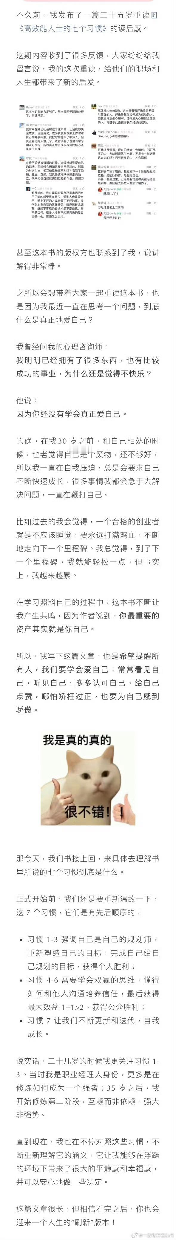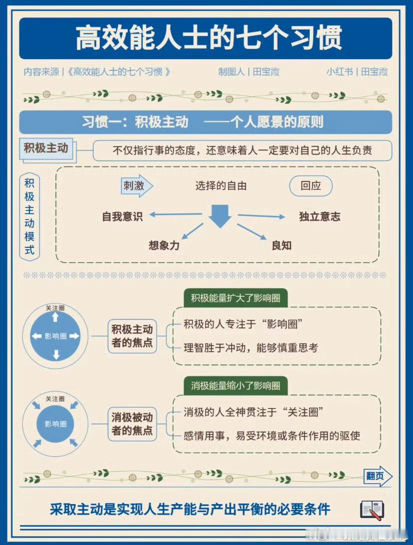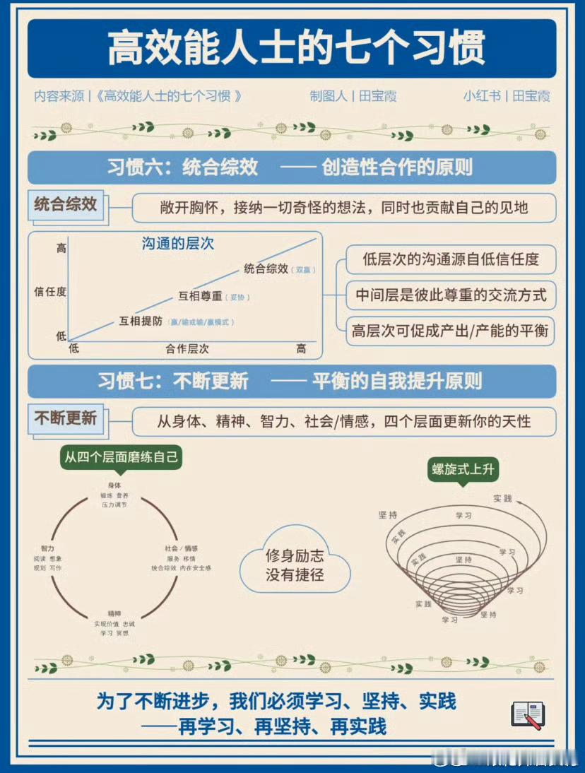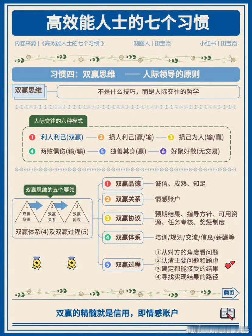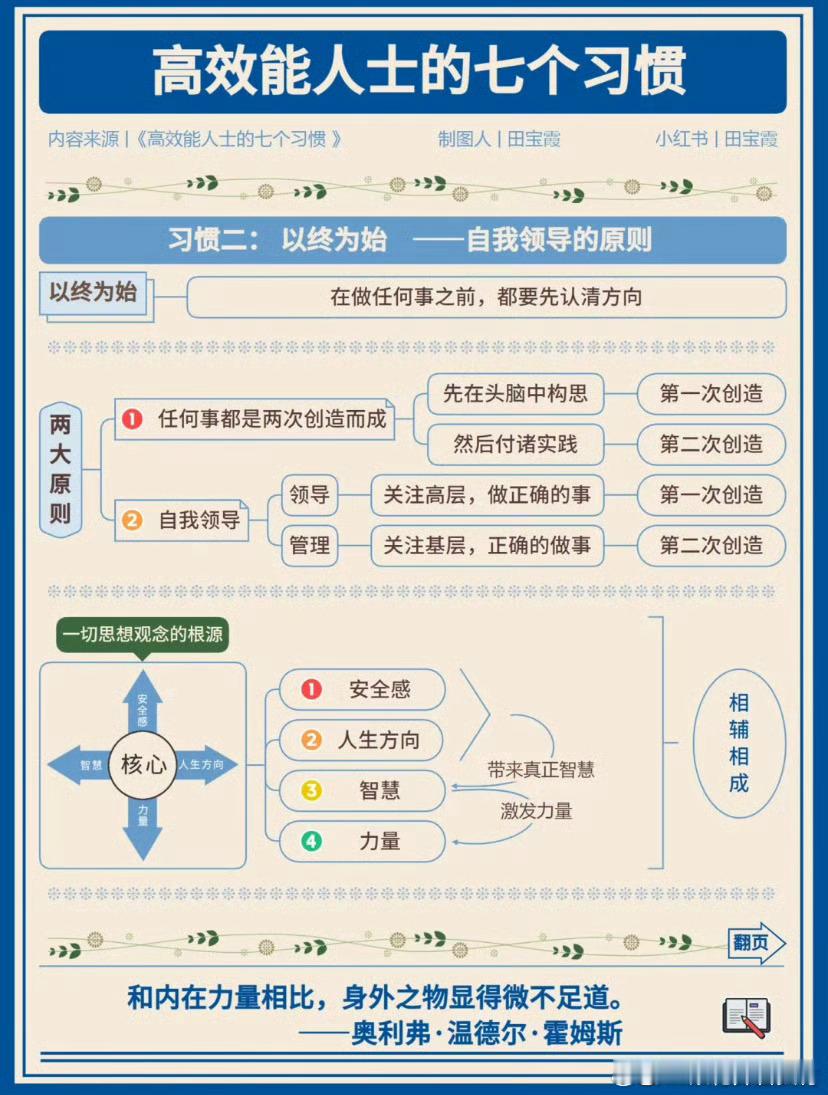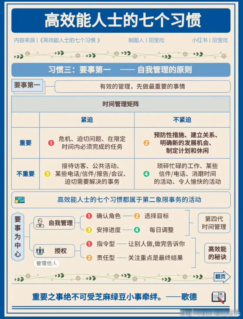《高效能人士的七个习惯》的思维导图框架及核心要点,综合书籍精髓与搜索结果提炼而成:🌟 思维导图框架一、个人领域的成功(从依赖到独立)习惯一:积极主动(Be Proactive)核心:在刺激与回应间保留选择自由,聚焦“影响圈”(可控之事)而非“关注圈”(不可控之事)。实践工具:用主动语言(“我能”代替“我必须”);每日记录影响圈行动(如学习新技能、调整作息)。习惯二:以终为始(Begin with the End in Mind)核心:所有事物需两次创造——先在脑中构思目标,再实践。实践工具:撰写个人使命宣言(如:“我希望葬礼上被如何评价?”);用“目标倒推法”制定计划(年度→季度→周→日)。习惯三:要事第一(Put First Things First)核心:按“重要性”非“紧急性”管理时间,优先处理第二象限事务(重要不紧急)。实践工具:时间管理矩阵(图例见下方👇);责任型授权(明确结果而非过程)。时间矩阵示例:| 紧急 · 重要(20%) | 不紧急 · 重要(65%) || 紧急 · 不重要(15%) | 不紧急 · 不重要(2”的解决方案。实践工具:沟通三层次:提防→妥协→协同;提问引导:“能否共创更好的方法?”。三、自我更新与平衡习惯七:不断更新(Sharpen the Saw)核心:在四个维度持续投资,形成螺旋式成长。实践工具:身体:规律运动、健康饮食(如地中海饮食);心智:阅读/写作/学习新技能;情感:维护关键人际关系;精神:冥想/自然体验/价值观反思。💡 关键逻辑与误区提醒习惯关联性:前三个习惯是“个人成功”根基,后三个实现“公众成功”,第七习惯贯穿全程。常见误区:误将“紧急事务”当核心(忽略第二象限)→ 导致长期忙碌低效;双赢思维≠妥协 → 需建立信任与明确协议。🚀 实践建议(融合最新研究)每日两分钟法则:遇到两分钟内可完成的事(回邮件/整理桌面),立即处理。精力管理:用“番茄工作法+NASA小睡法”(25分钟专注+5分钟闭眼休息)提升专注力。输出式学习:用“费曼技巧”将书中知识讲给他人,留存率提升至90%。