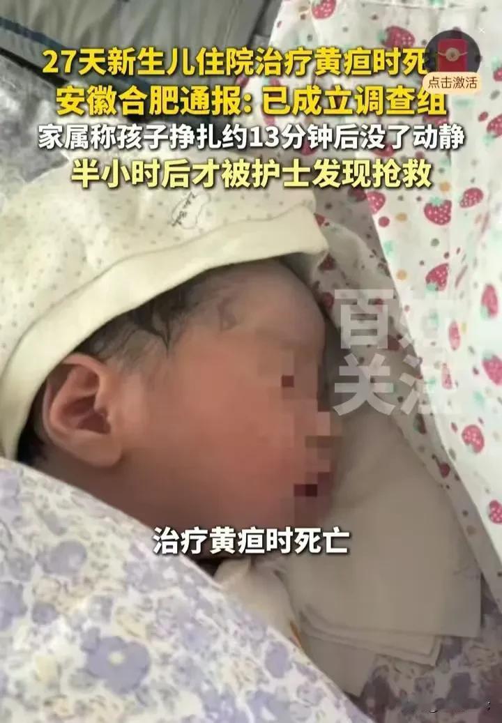 安徽合肥,出生27天的新生儿,住院治疗黄疸,护士给孩子喂了奶,就不管孩子了,孩子
