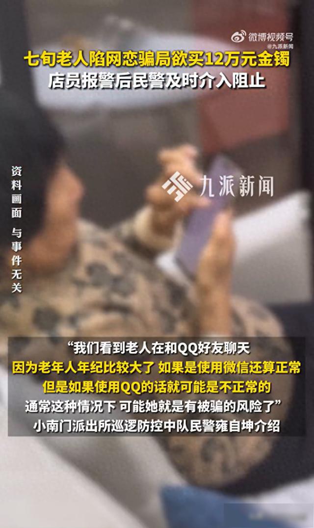 前两天,昆明小南门派出所接到辖区一家金店工作人员报警,说店里来了一位七旬老人,执意要购买金额较高的黄金饰品,疑似遭遇了诈骗。“我们看到老人在和QQ好友聊天,因为老年人年纪比较大了,如果是使用微信还算正常,但是如果使用QQ的话就可能是不正常的。”小南门派出所巡逻防控中队民警雍自坤介绍。民警耐心劝说,老奶奶终于放下了戒心,告诉民警自己通过网络结识了一名网友,对方每天嘘寒问暖,逐渐获取了自己的信任。
