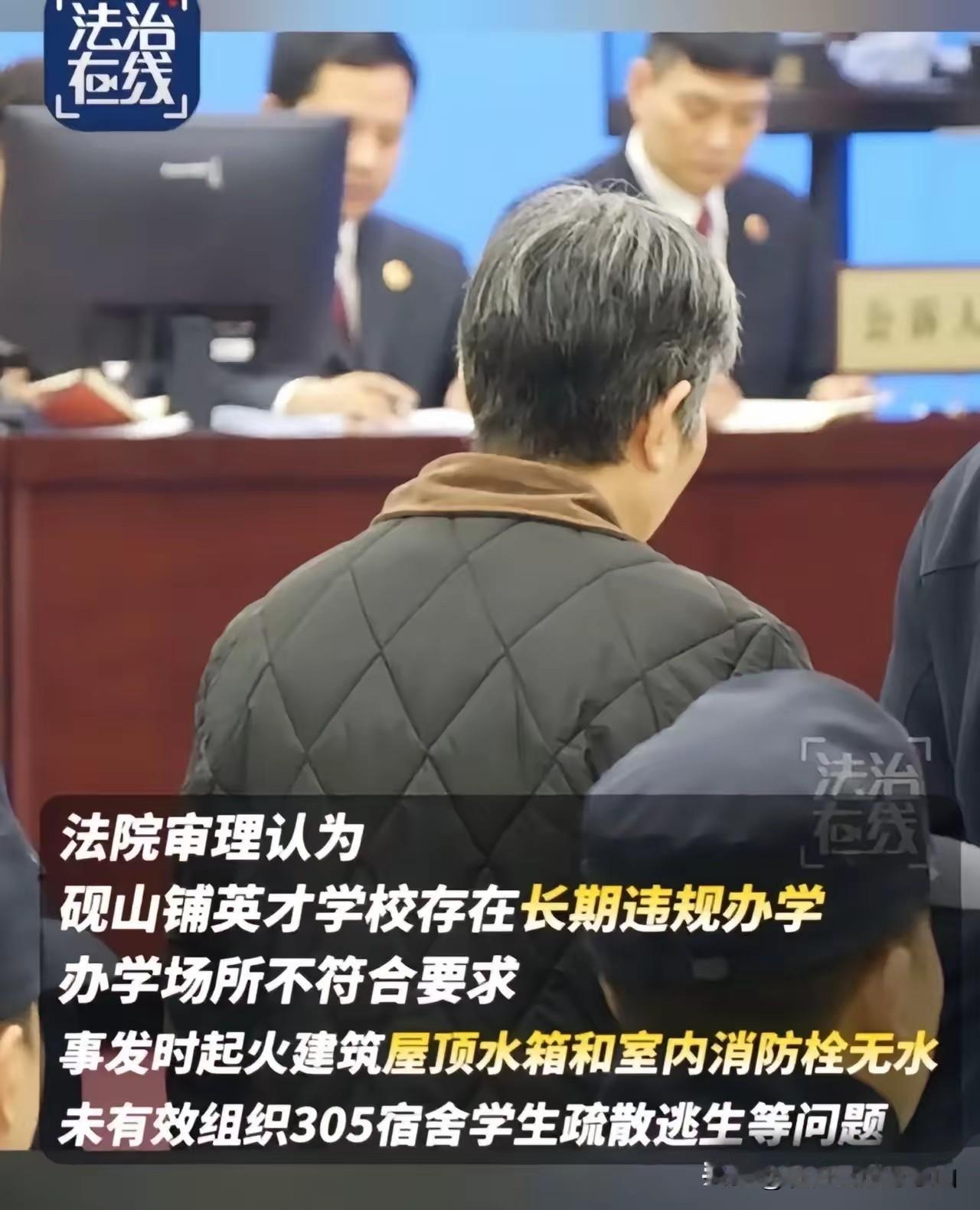贾老师,你的背影让我心疼,你的职业注定你只能牺牲自己,成全别人,点火的孩子才8岁,他还不懂事,但是你已经58岁了,你怎么逃得过责任? 一场大火,死了13人,虽然溺疏散了100多人,但是你不是神,你是人,是人就有纰漏,这13个孩子葬身火海,说怪你没有及时报警,你当时多傻啊!第一时间打个报警电话,是不是就不用判六年那么多了? 还说你把33个学生安放在一个宿舍不符合办学要求,你既当老师,又当宿管,看似身兼多职,其实责任重于泰山,当宿管一个月比别人多不了几百元钱吧!但是屁事一箩筐。 因为没有人干,这个工作你应付下来了,但是大半夜失火,你一个58岁的老太太实在无力回天啊!钱只多了几百元,现在发生事情牢狱之灾免不了了,你的六年大牢主要原因还是是因为你是宿管,作为宿管就得对学生负责,有不管你是兼职还是专任的。 消防栓没有一滴水, 你为什么不及时察觉?屋顶水箱没有水,你为什么不第一时间查看?火警报警器坏了,你为什么不及时上报?33个学生挤在一间宿舍,作为班主任的你为什么不上报?发生火灾,你为什么不第一时间报警?孩子带打火机进宿舍,你为什么不没收?火那么大,你为什么不及时组织305宿舍学生及时逃离?你看吧!这些问题法官在庭审席上一条一条问下来,你是不是一条都回答不上来? 你讲不过的,没有理可讲,因为13条鲜活的生命已经消失了,家长们痛苦万分,学校焦虑不安,急需一个人来当那个罪魁祸首,需要一个人万劫不复,正需要一个人为这个事情买单,而你刚好遇上。