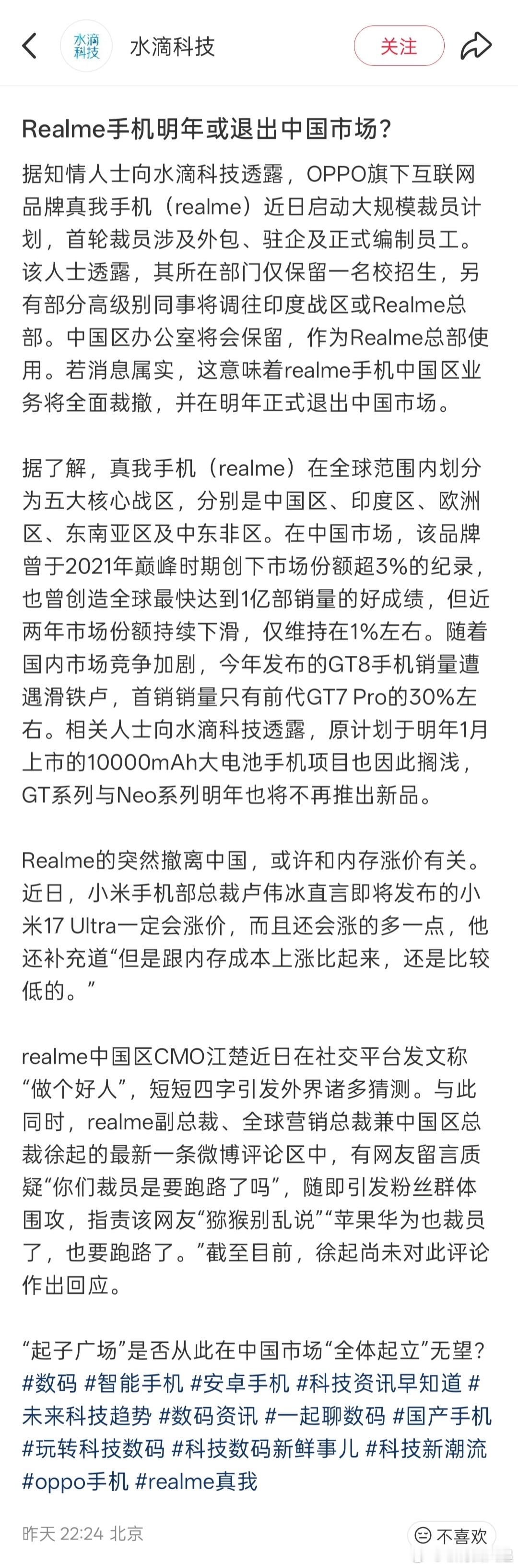 这个水滴科技什么来路,注册一个号就为了发realme可能退出中国市场的消息?