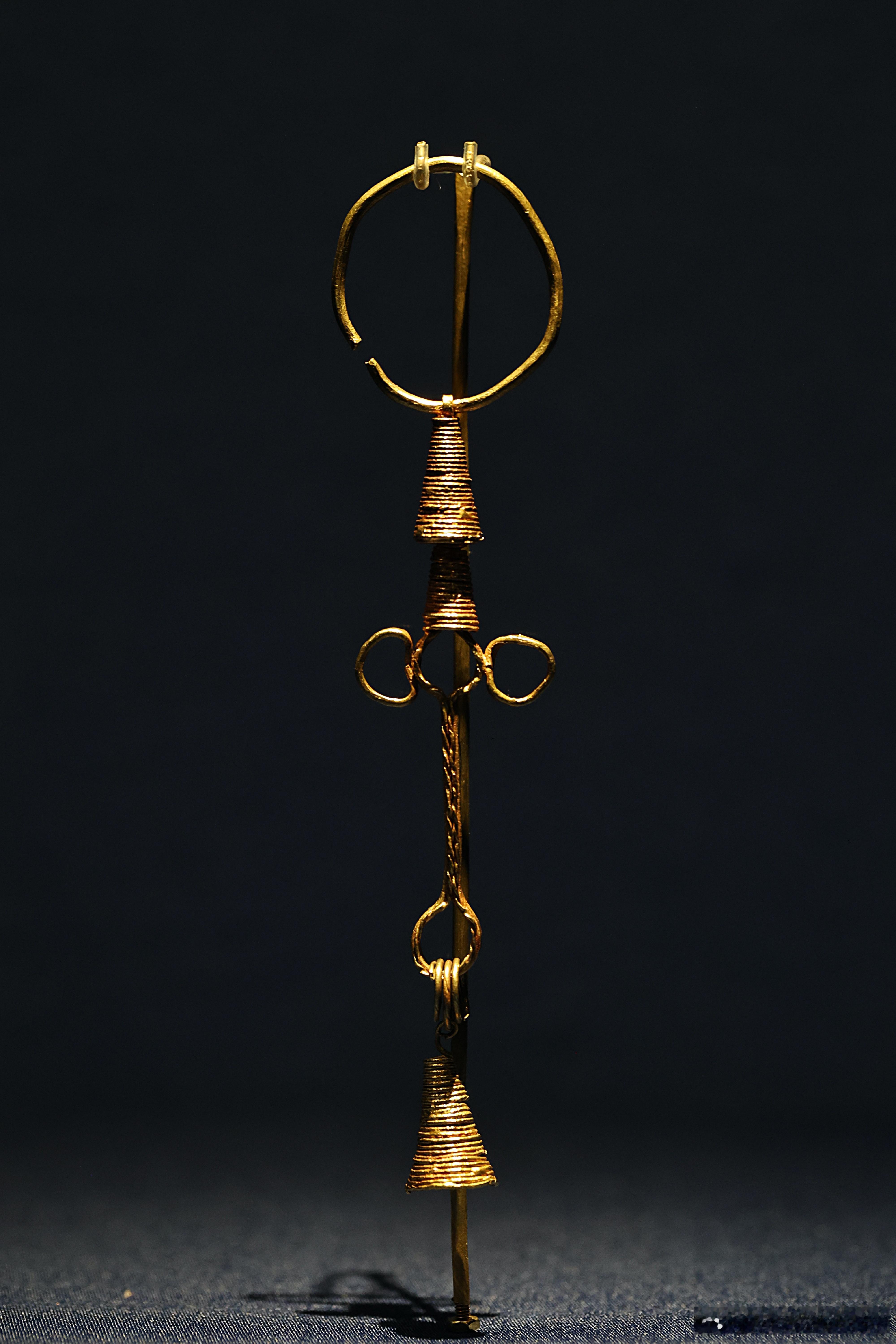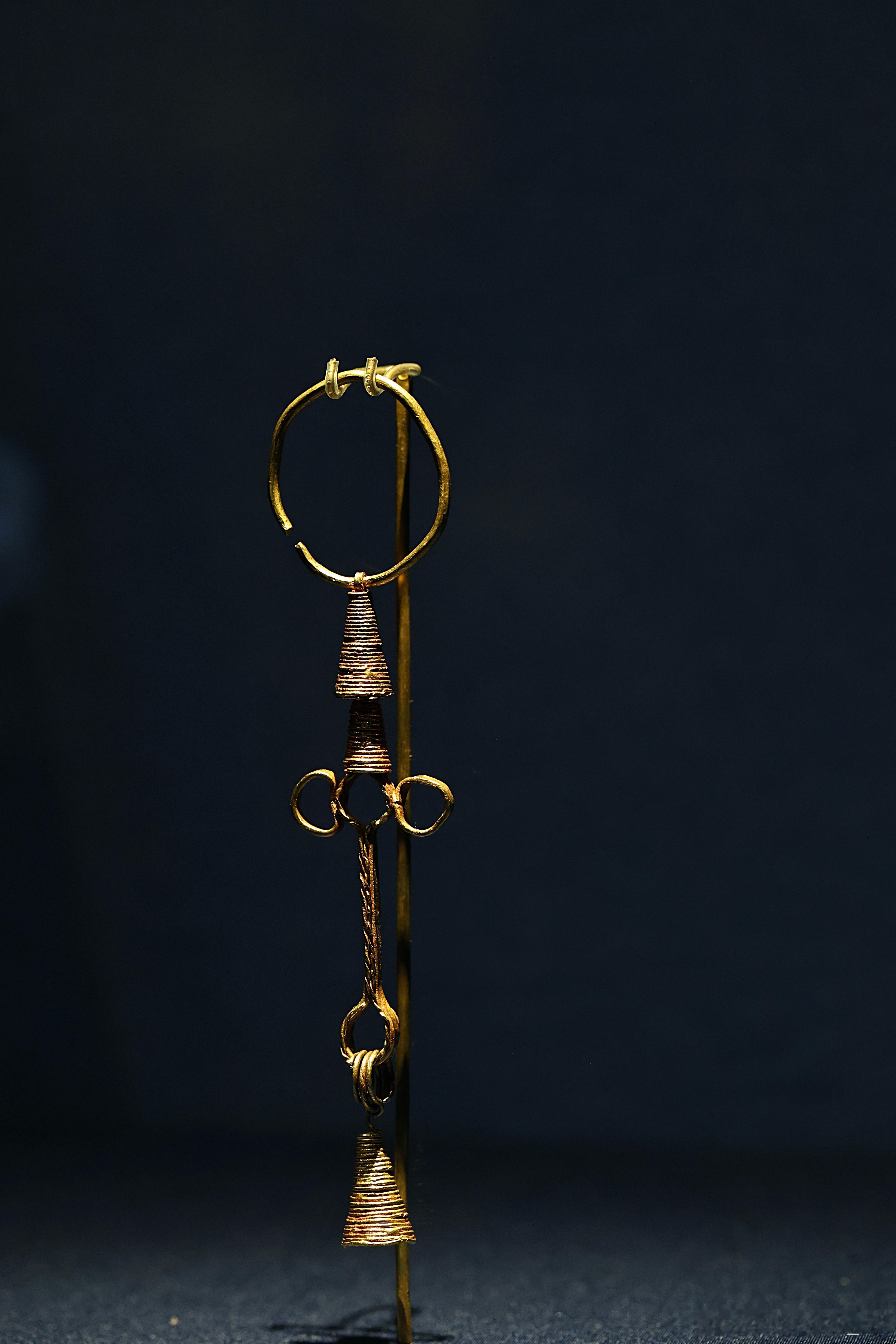 黄金缕-香港故宫文化博物馆藏古代金器 锥形耳坠公元前4–公元前3世纪这是一件典型的匈奴草原器物,由三个锥形饰和近乎环状的金环相连组成的耳坠。锥饰由盘缠卷曲紧密的金线制成,最大的金环为先浇铸后锤揲而成。摄于首都博物馆2025.11.8