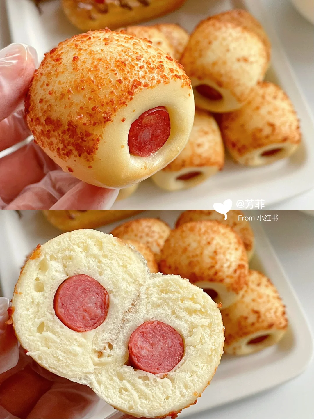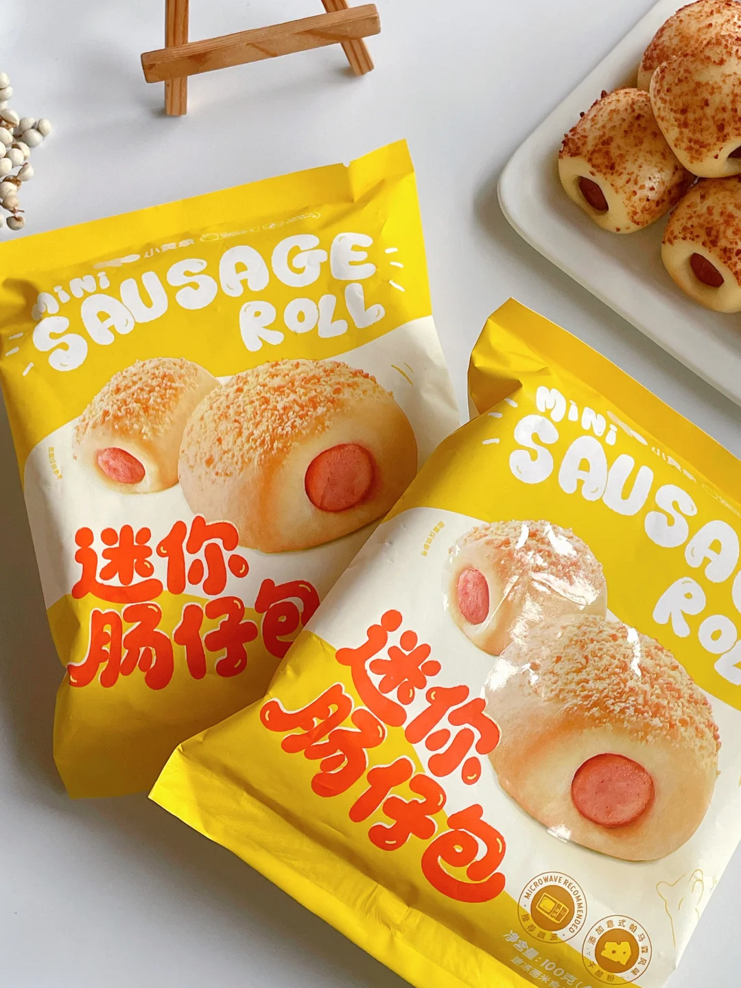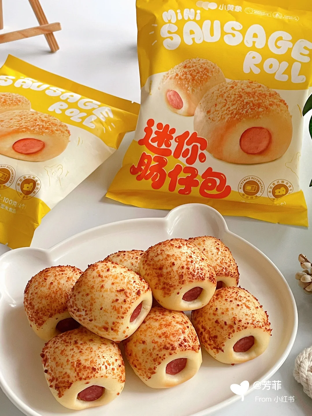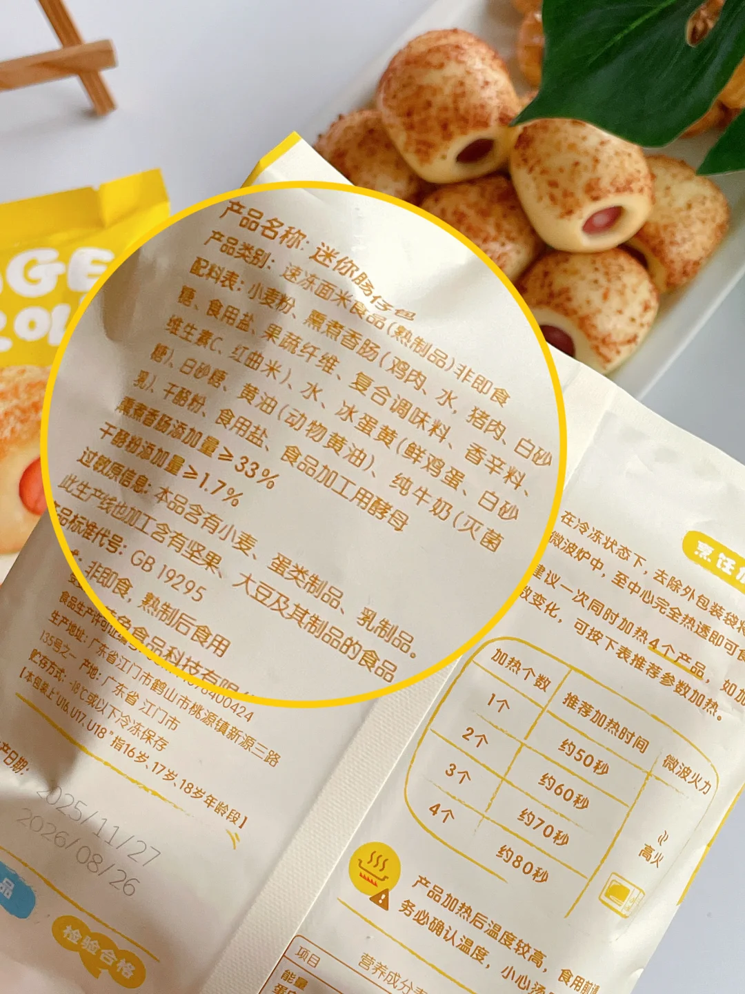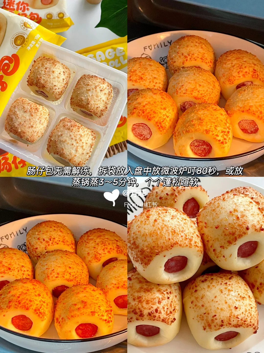 3️⃣小黄象肠仔包无需解冻,拆袋装入盘中放微波炉叮80秒,托盒是PP材质可直接微波,很方便。或者放蒸锅蒸3~5分钟即可