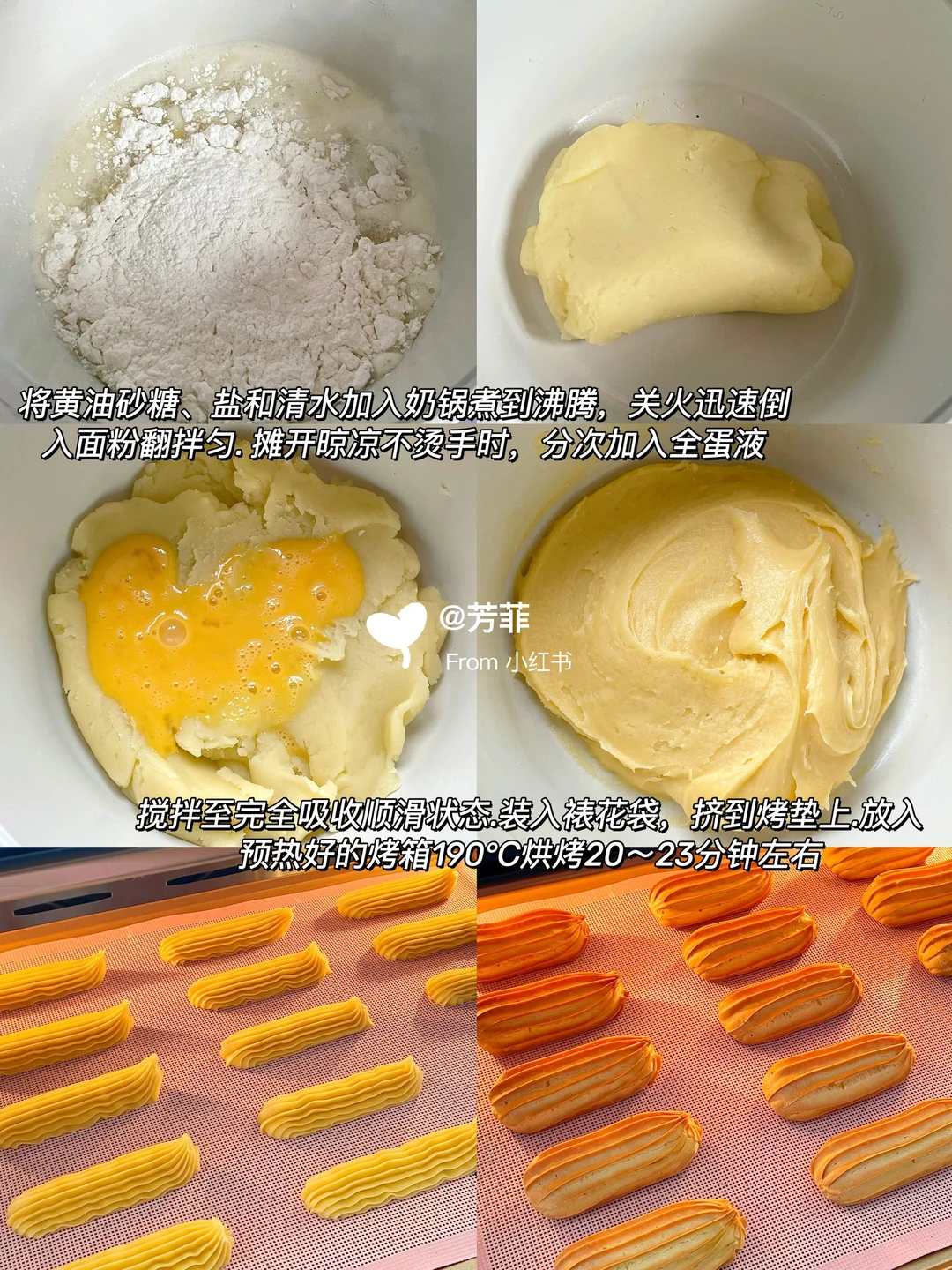 2️⃣搅拌至完全吸收顺滑状态.装入裱花袋,挤到烤垫上.放入预热好的烤箱190℃烘烤20~23分钟左右.烤好是圆鼓鼓金黄空心不塌陷的状态,也可以油炸