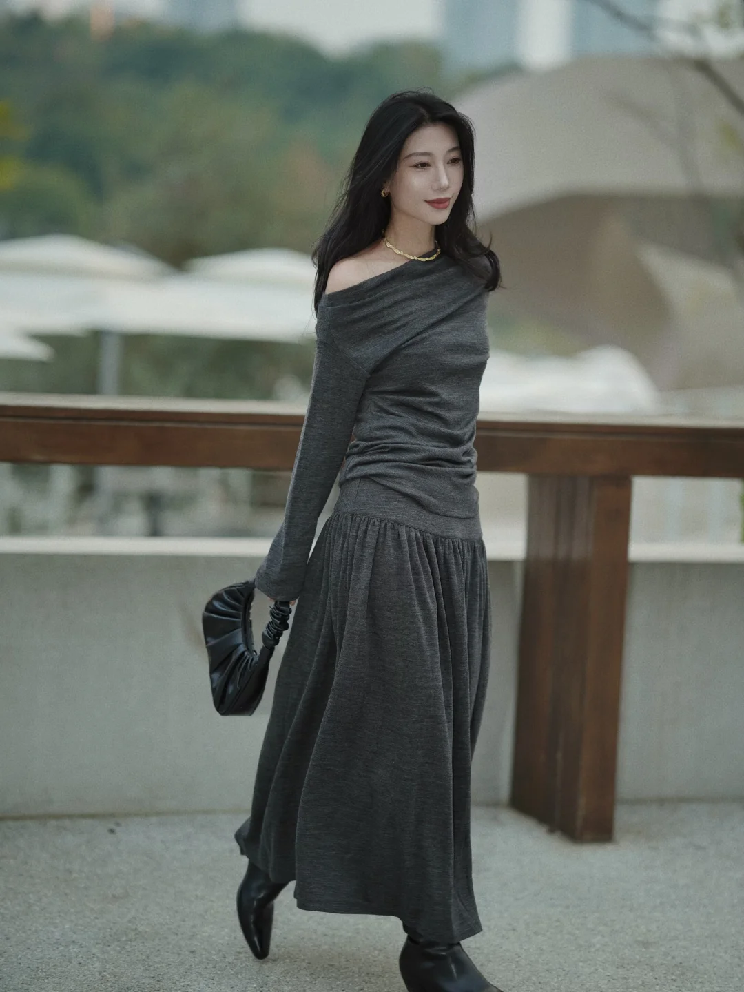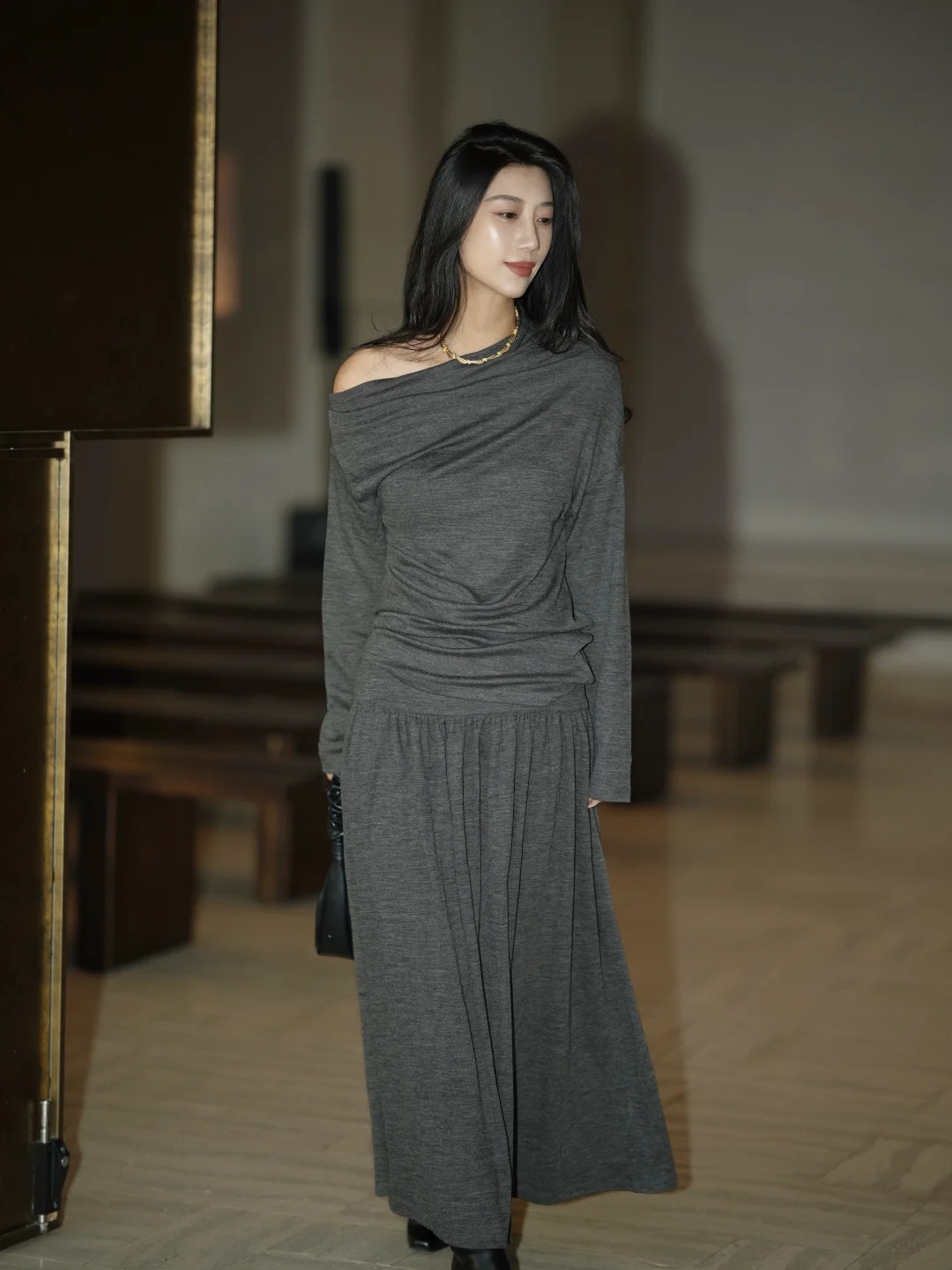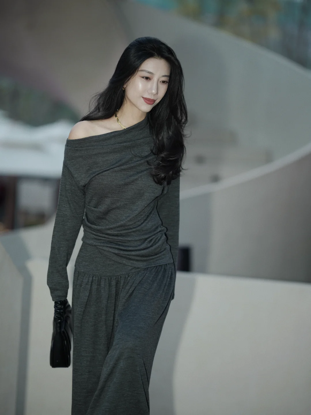 冬天赴约,在厚厚的羽绒服中我选了灰色设计感的裙子,它像一片柔软的暮色,安静裹住我。 搭平底靴子,镜子里的人简净温和——正是我想带给老友的样子。 脱去羽绒服的包裹,裙摆拂过靴筒。忽然想起从前我们总在冬夜挤作一团,分享滚烫的心事。此刻傍晚的余光是朋友间一起聊天留影的放松时刻。 灰是留给自己的余地。在喧闹聚会中,它让我既在场,又拥有随时静下来的可能。 推开门,暖意和笑声迎面扑来。我的灰裙子,正适合融进这片久违的热闹里。