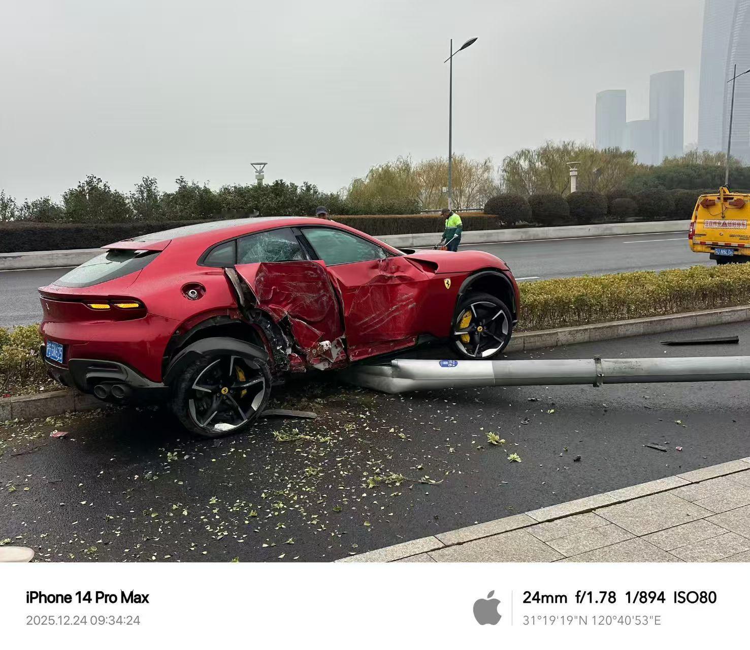 啊?送圣诞礼物跑太急了吗?谁的纯血法拉利FUV撞灯柱上了