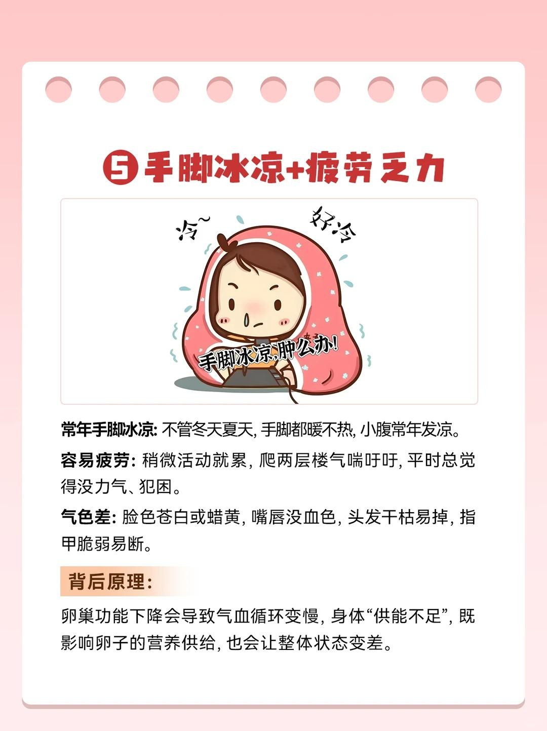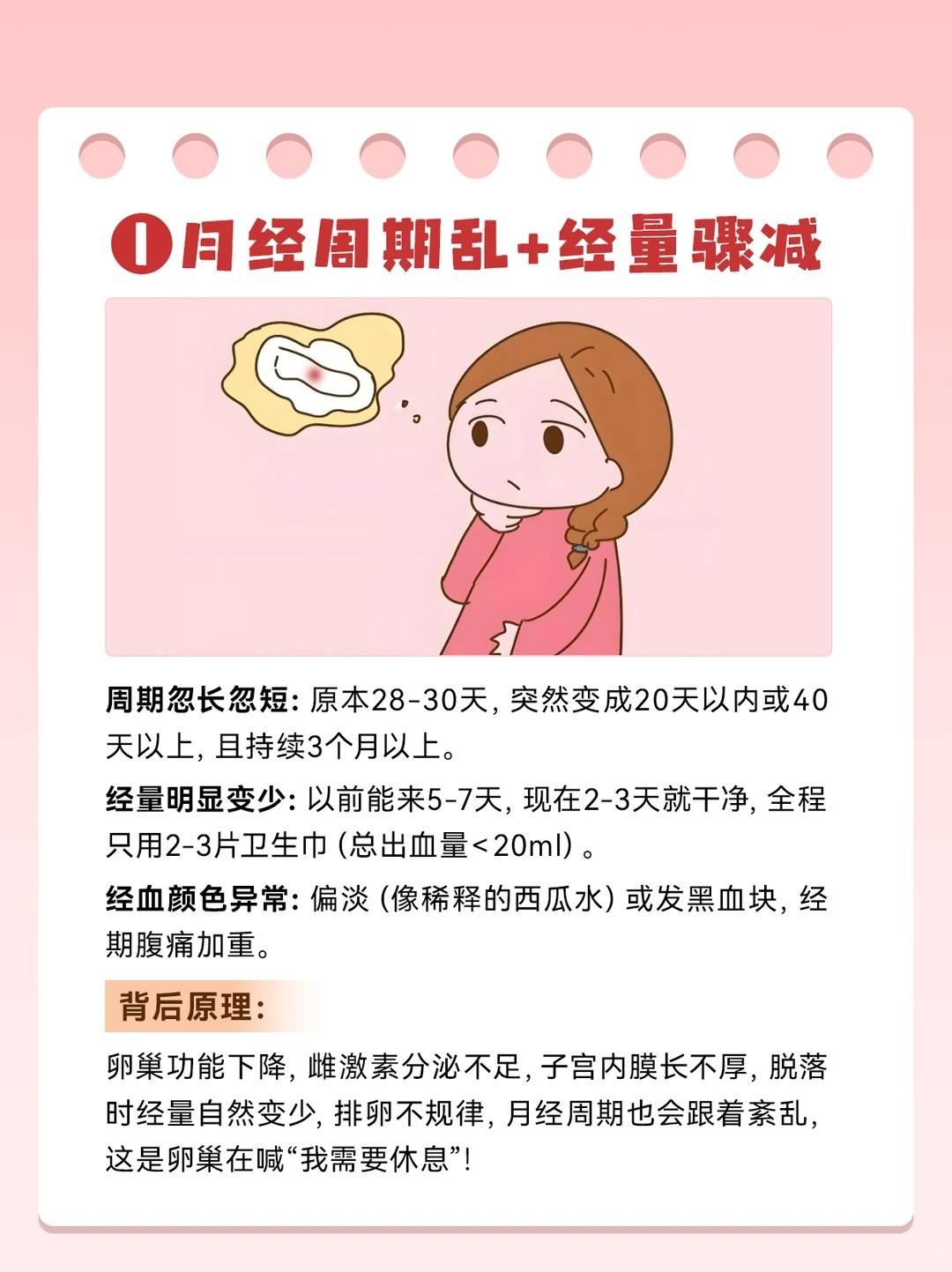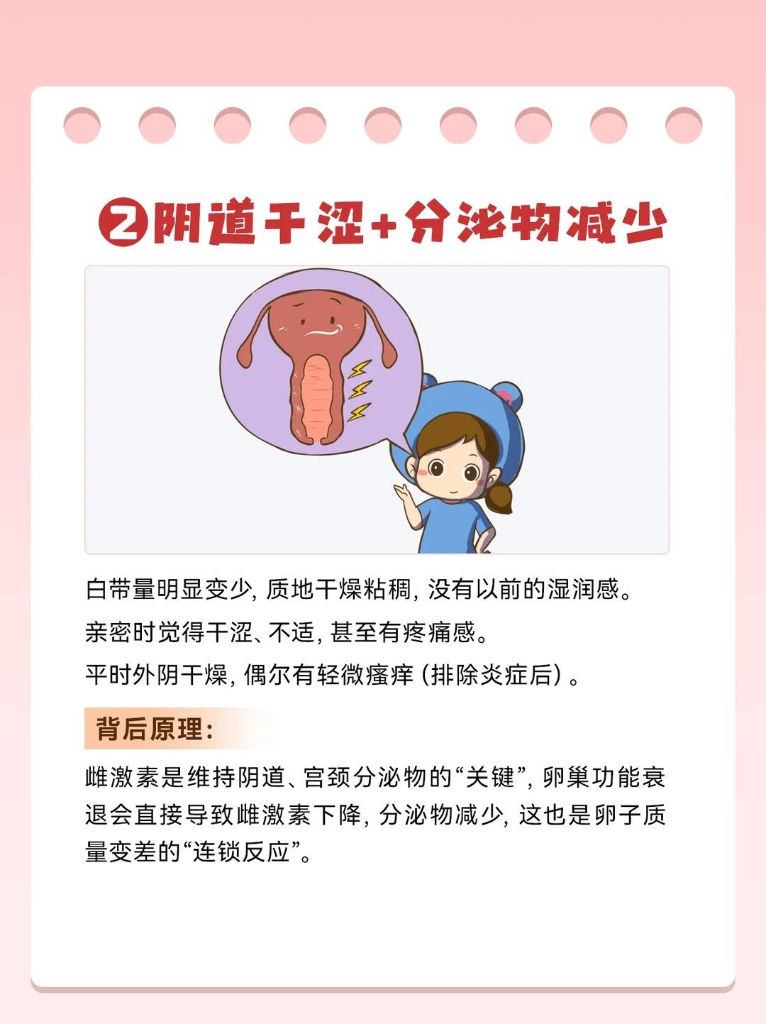 【被忽视!卵巢早衰的6个预警信号!】 1.月经周期乱+经量骤减 2.阴道干涩+分泌物减少 3.情绪失控+失眠盗汗 4.体毛异常增多+反复爆痘 5.手脚冰凉+疲劳乏力 6.备孕困难