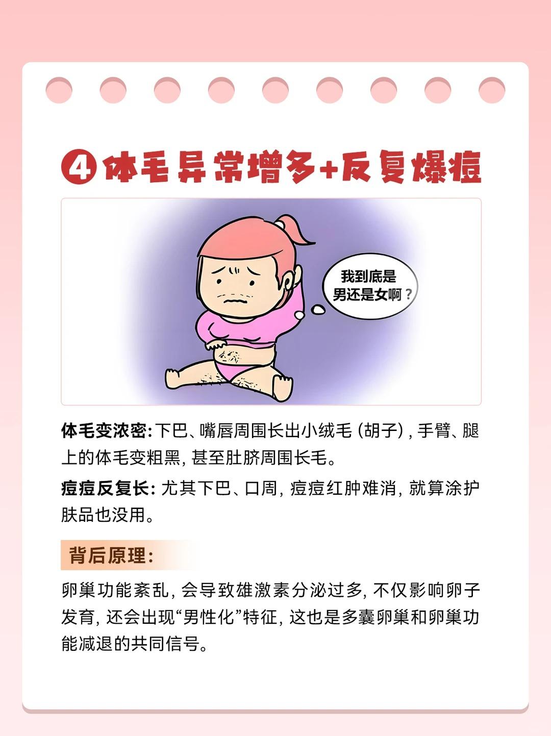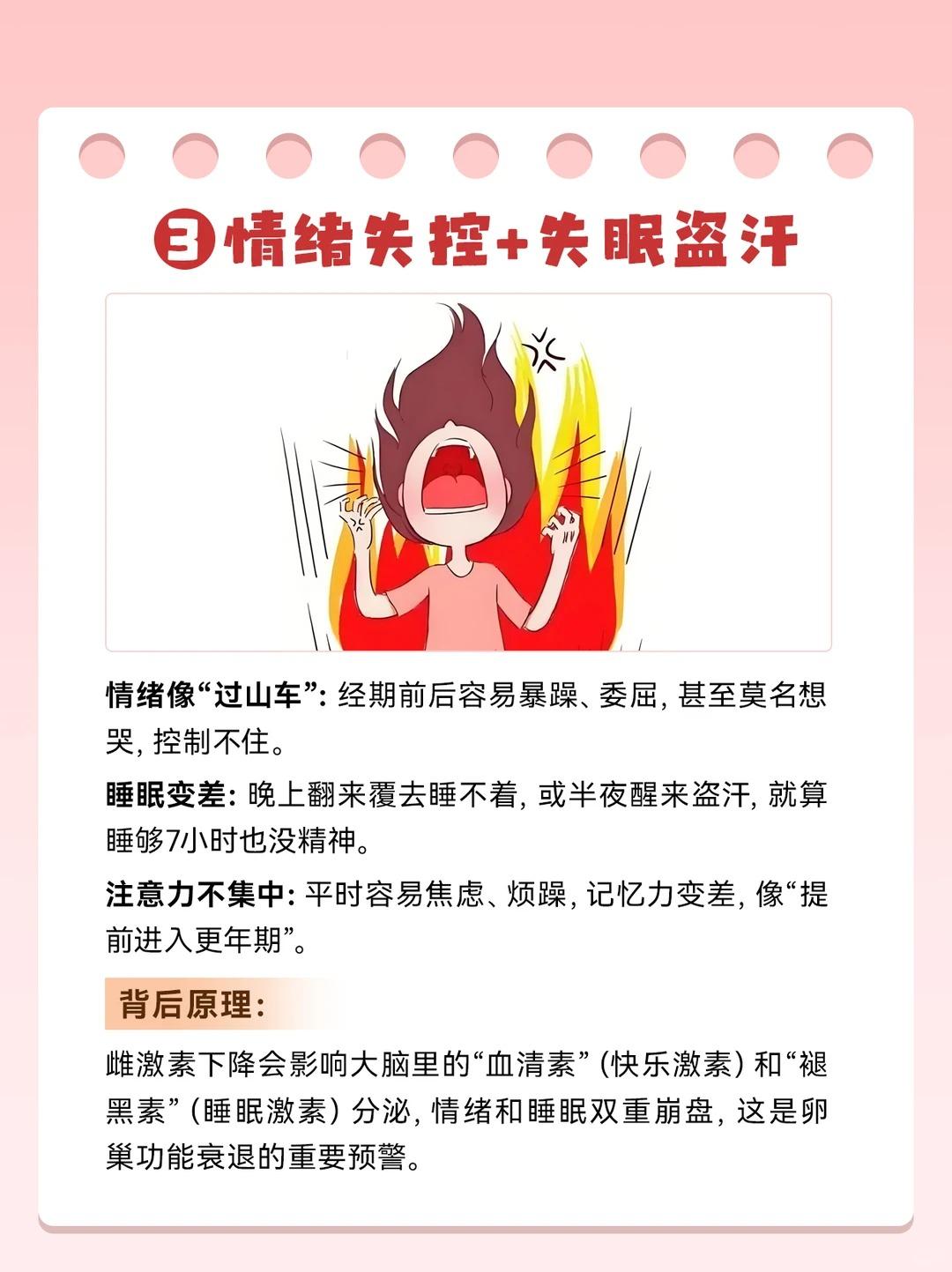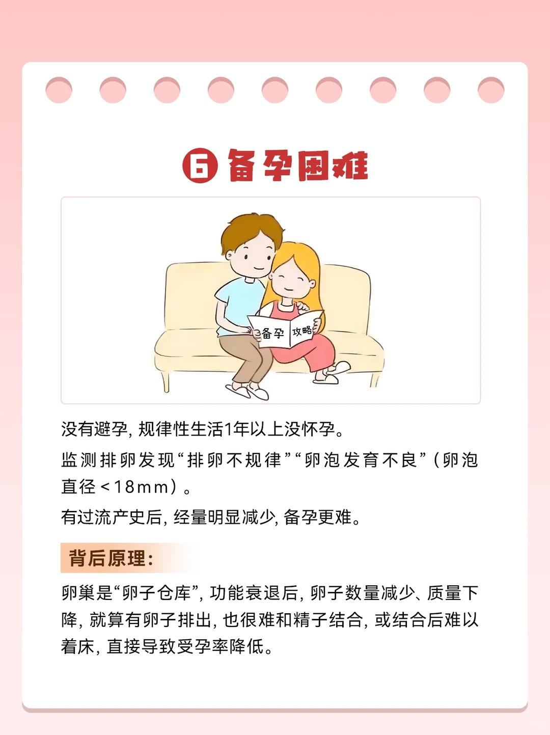 【被忽视!卵巢早衰的6个预警信号!】 1.月经周期乱+经量骤减 2.阴道干涩+分泌物减少 3.情绪失控+失眠盗汗 4.体毛异常增多+反复爆痘 5.手脚冰凉+疲劳乏力 6.备孕困难