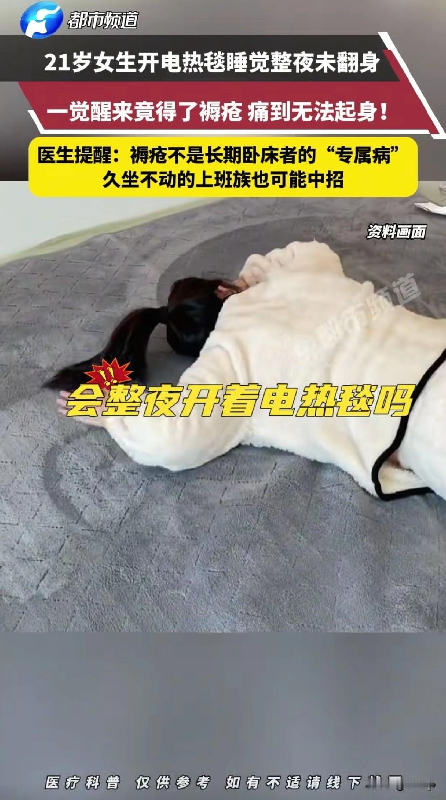 杭州21岁女生服用安眠药睡觉 开了一夜电热毯,第二天醒来屁股疼痛无法起身,竟然是长了褥疮 在家观察不见好转,于是母女俩去了医院,通过几天的治疗已经出院 这位女生因为长期颈椎疼,休学在家 那天是偷偷的服用安眠药,睡的太沉一夜没有翻身 杭州冬天的天气也不算很冷,现在跟山东这边的气温差不多,应该还不至于开电热毯睡觉吧