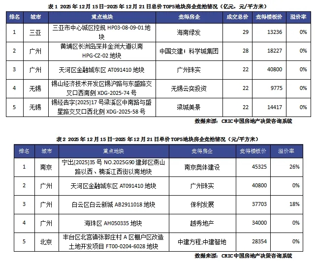 2025年12月15日-2025年12月21日(第51周),土地供应规模延续年末周期性低位,成交规模延续上周高点,成交金额创下年内新高,土拍热度如期继续回落。本周重点城市监测范围内,土地供应建筑面积190万平方米,环比下降16%;成交建筑面积1651万平方米,环比微降1%;本周平均溢价率为1.1%,环比下降1.2个百分点。