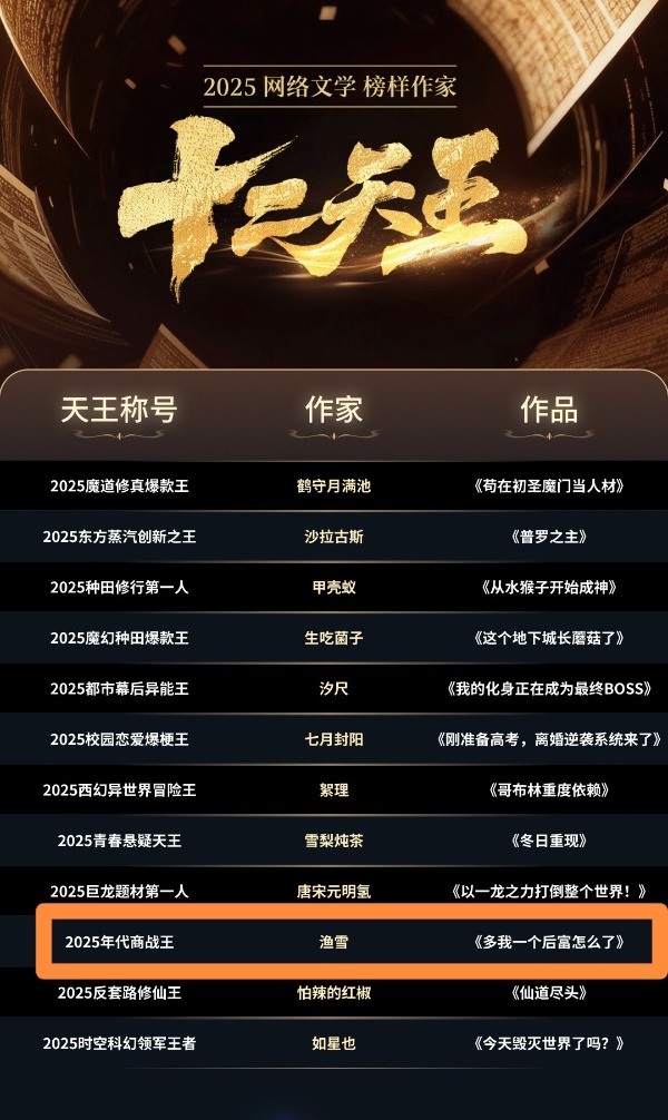 大皖新闻讯12月24日,阅文集团发布了2025网络文学榜样作家“十二天王”名单,鹤守月满池、沙拉古斯、甲壳蚁、生吃菌子、汐尺、七月封阳、絮理、雪梨炖茶、唐宋元明氢、渔雪等入选,成为过去一年网络文学创新力量的代表。值得一提的是,结合作品数据、读者口碑、文学品质与创新性等多重维度评选,安徽亳州的90后作家渔雪凭借《多我一个后富怎么了》登榜。
