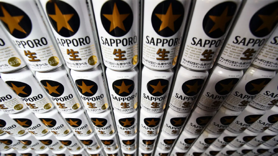 日本北海道惠庭市的札幌啤酒工厂内,堆叠摆放的札幌黑标啤酒罐装产品。