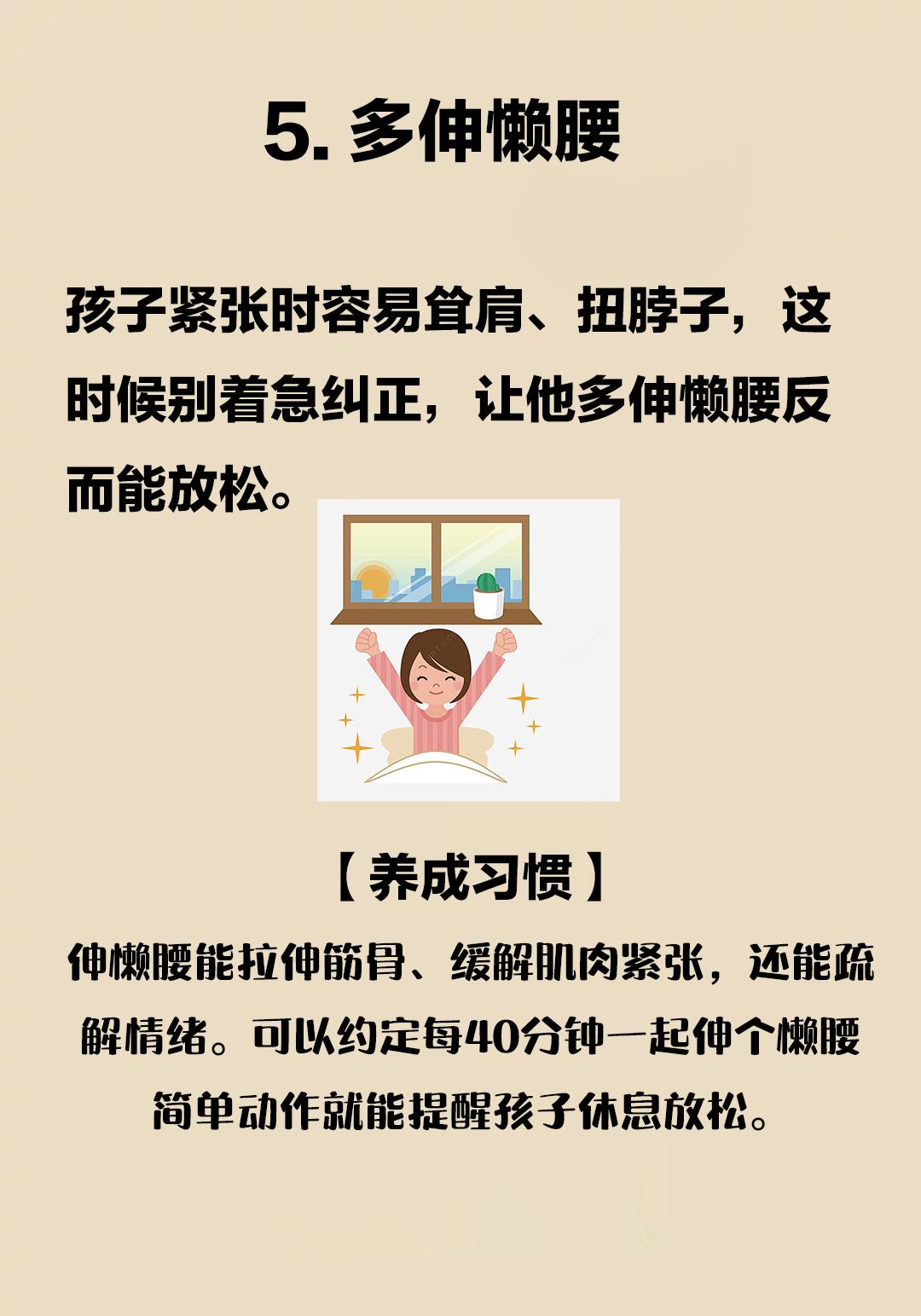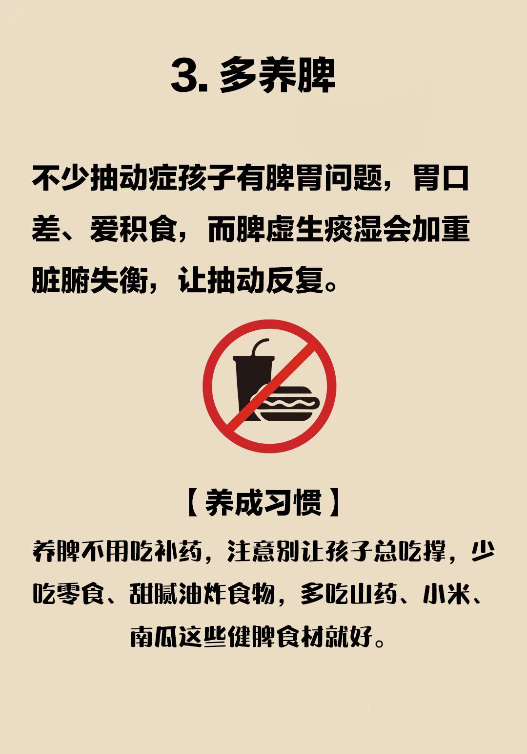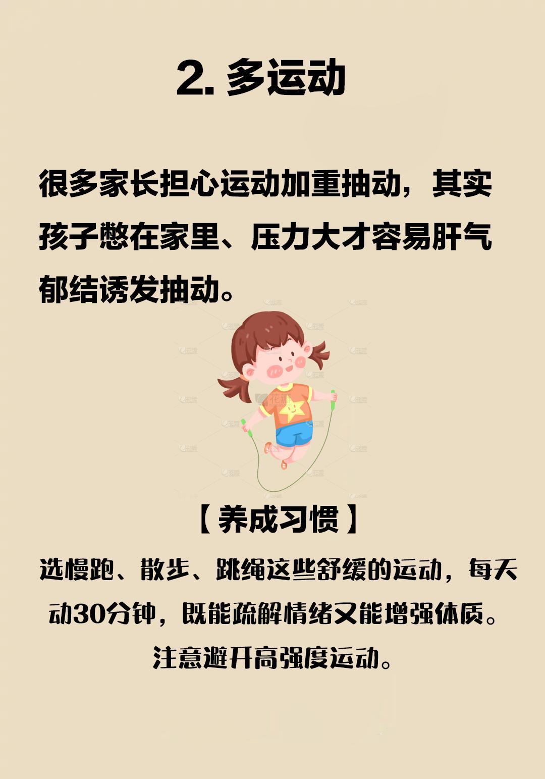 抽动症孩子,这5个好习惯,越早养成越好!孩子少遭罪,家长少花钱 今天就把这5个看似摆烂,实则能帮孩子稳抽动的行为分享给家长们。 1. 多睡觉 2. 多运动 3. 多养脾 4. 多吃蔬菜 5. 多伸懒腰
