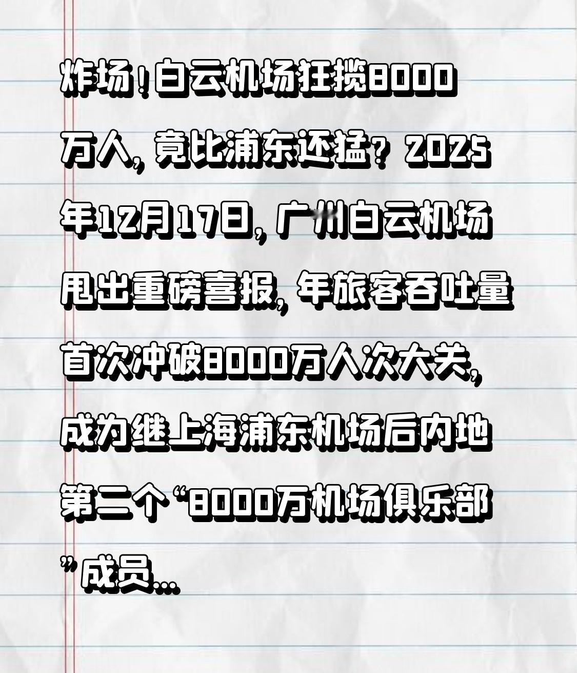 炸场!白云机场狂揽8000万人,竟比浦东还猛? 2025年12月17日,广州白云机场甩出重磅喜报,年旅客吞吐量首次冲破8000万人次大关,成为继上海浦东机场后内地第二个“8000万机场俱乐部”成员。其中国际旅客超1660万人次,全年剑指8300万新高,这个南方航空枢纽用数据上演了一场硬核逆袭。 硬核增长离不开硬件升级。T3航站楼投运搭配第四第五跑道启用,“3座航站楼+5条跑道”的格局让运力翻倍,T3里的智能值机、快速安检成了旅客出行标配,高颜值设计还成了网红打卡点。日均超1500架次航班平稳运行,全靠机场运管委与空管航企的默契配合,高峰延误率大幅下降。 国际航线更是开足马力,全年新开加密恢复近40条国际航线,新增马德里、阿尔及尔等8个航点,成为内地首个恢复印度直航的机场,国际及地区通航点超100个。国际旅客量同比暴涨19%,占比超20%,日均6600吨货邮处理量撑起全球商贸物流。 区域经济添足动力。十五届全运会期间开通赛事专属通道,单日保障135架次赛事航班,广交会等展会吸引70多国2000余精英汇聚。“航空+旅游”套餐搭配机票券包,让广州“花城”魅力持续吸客。从2020年全球最忙机场到连续四年全国第一,20.89%的同比增幅在白热化的千万级机场竞争中站稳脚跟。 8000万客流背后是大湾区经济的强劲脉动,这座枢纽每增100万旅客就能带动广州GDP增长29.9亿元。你觉得白云机场明年能超越浦东,登顶全国第一吗?