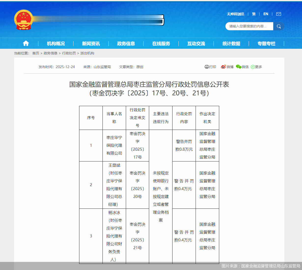 时任枣庄华宁保险代理有限公司总经理王显斌、时任枣庄华宁保险代理有限公司财务负责人杨冰冰,分别被警告并罚款0.4万元。