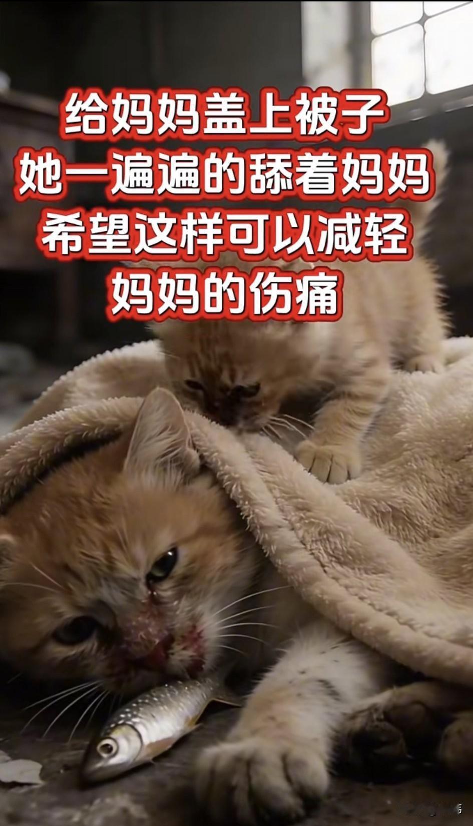 泪目了!一只流浪猫妈妈受伤了,它趴在地上哀嚎,不知道自己能不能撑过去,此刻它脑子里想得都是它的孩子,一只被好心人收养的猫宝宝。 而它的孩子正在玩着毛线球的猫宝宝,忽然感应到了什么,是不是妈妈有危险,于是它特意叼了妈妈最爱吃的鱼干,凭着妈妈的气味去找妈妈,幸运的是还真的被它找到了妈妈,它开心的鱼干给妈妈吃,可病入膏肓的妈妈根本吃不了鱼,看妈妈病了,它又跑回主人家里叼来一块毛巾盖在妈妈身上,一遍又一遍地舔着妈妈,希望这样可以减轻妈妈的伤痛。 而收养它的主人发现了小猫的异常,跟着它找到这里,看着眼前的的一幕,她直接被感动的潸然泪下,善良的她就把猫妈妈送去了宠物医院治疗,幸运的是治疗之后它就康复了,于是也收养了它,这样一来猫咪母子就可以生活在一起了。