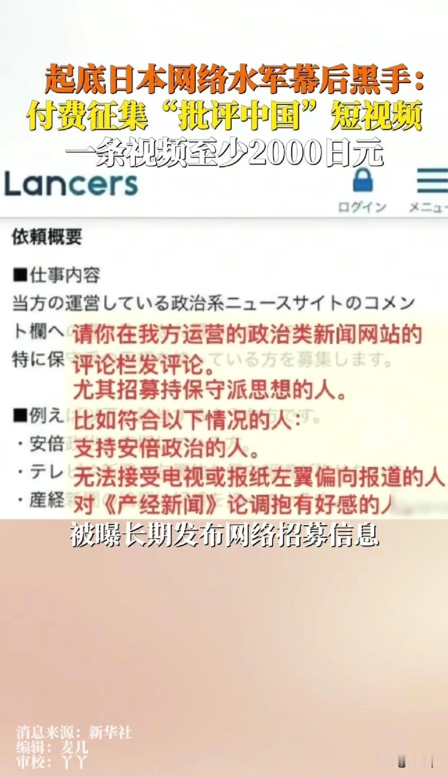 新华社起底日本网络水军幕后黑手 日本的一个大型众包平台 长期发布网络招募信息,付费征集“批评中国”等内容的短视频 从散布仇恨言论到为右翼分子造势,一条操纵网络舆论的外包链条浮出水面 日本绝大部分的家伙,其心可诛 以前总是能看到一些视频说它们的匠人精神,无非就是自己夸自己,伪善的面具下是狼子野心,从古到今的倭国人,仍然重末节而轻廉耻,美军飞行员查尔斯·斯韦尼在二战50周年纪念演讲时说,原子弹下无冤魂!