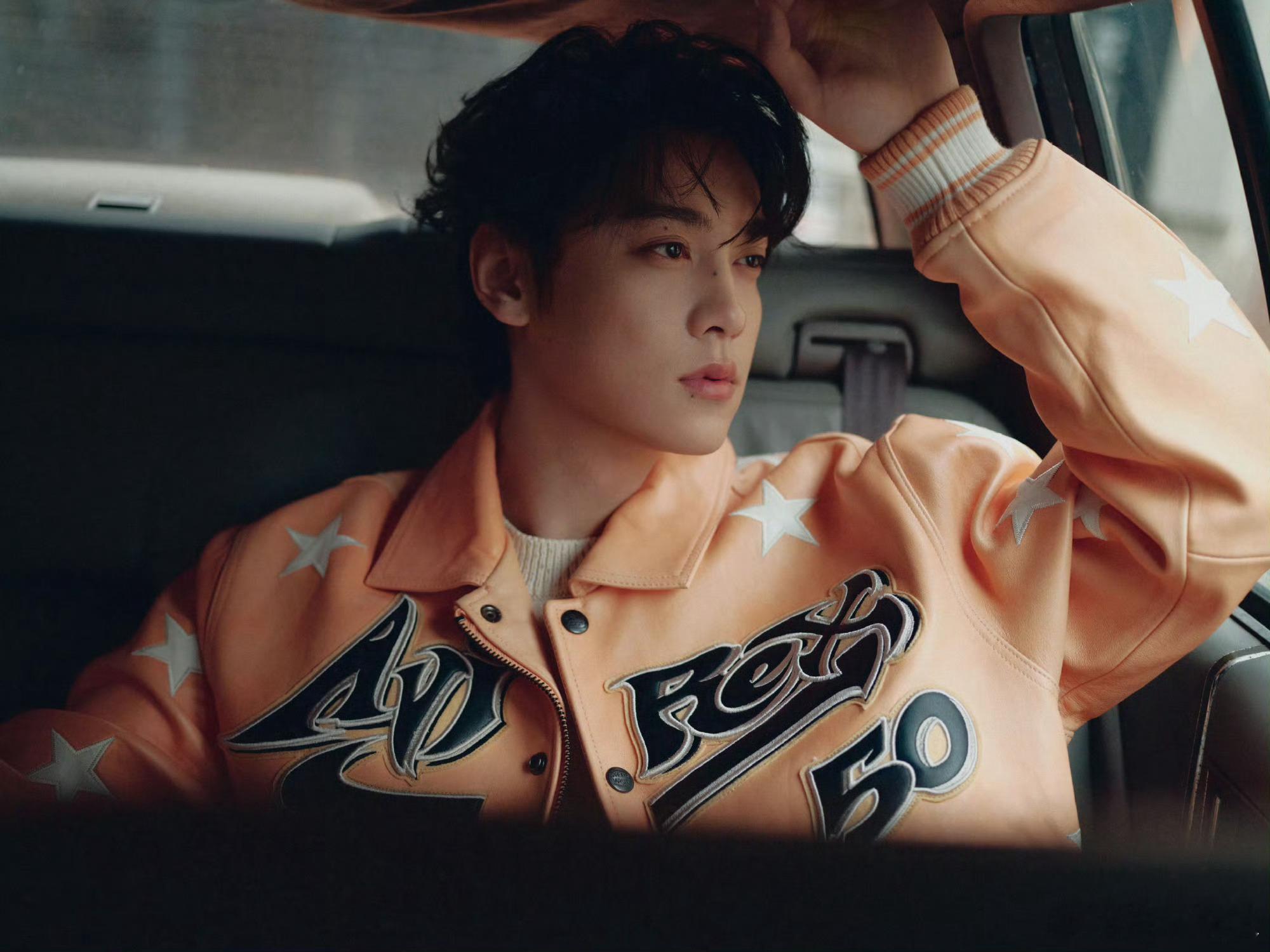 田栩宁随机掉落一组出发图,橙色星星棒球夹克造型太帅了,简单一拍就是大片,街头风男