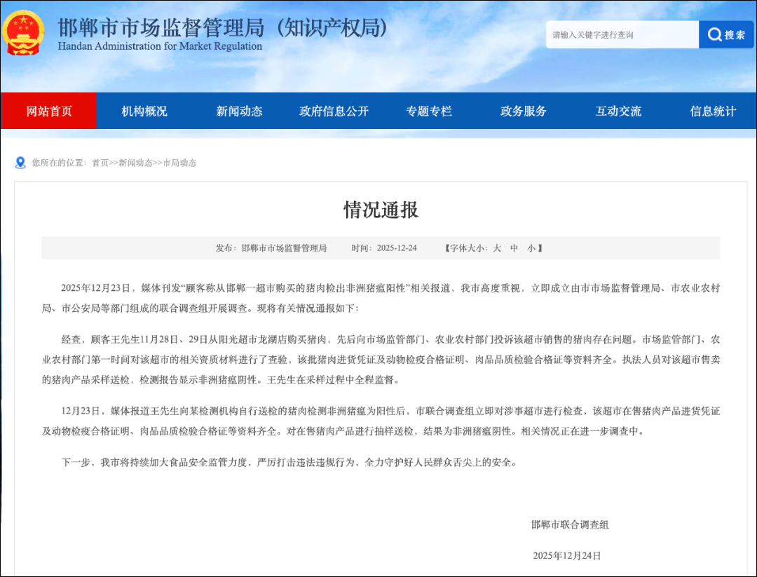 2025年12月23日,媒体刊发“顾客称从邯郸一超市购买的猪肉检出非洲猪瘟阳性”相关报道,邯郸市高度重视,立即成立由市市场监督管理局、市农业农村局、市公安局等部门组成的联合调查组开展调查。现将有关情况通报如下: