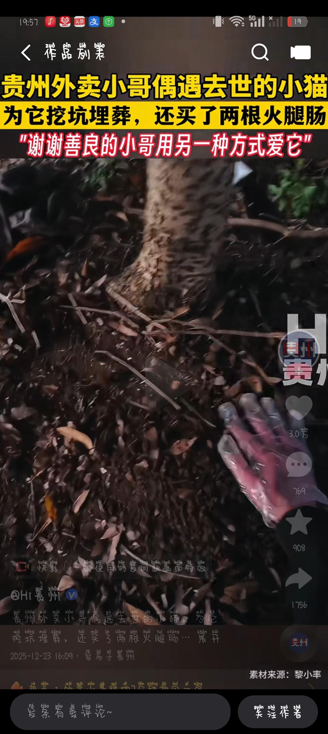 你以为外卖小哥只是个普通的快递员?错!他用行动告诉我们:善良,可以在最平凡的瞬间闪耀出最温暖的光。 那天,他在贵州的公路上送餐,偶遇一只无助的小猫,或许是迷路、受伤,或许只是想找个温暖的地方休息。面对那只瑟瑟发抖的小生命,他没有选择视而不见,也没有急匆匆地离开。 他停下脚步,用自己平凡的双手为它挖了个坑,轻轻地埋葬那只小猫。或许有人会说:“这只是一件小事,何必大惊小怪?”但正是这些细微的善意,才让我们看到人性最纯粹、最动人的一面。 更令人感动的是,他还特意买了两根火腿肠放在小猫的坟前,仿佛在说:“愿你在另一端的世界也能感受到一点点温暖。”这份细腻的爱,超越了金钱和时间的界限,温暖了无数人的心。 你是不是也在想:这个世界怎么会有如此善良的“普通人”?他们是不是都藏在角落里,只等着用最简单的行动,传递最真挚的情感?难道我们不也可以像他一样,用点滴善意,点亮身边的每一个角落? 或许,生活本身就是一场漫长的“善良比赛”。你我都在赛跑,但真正的赢家,是那些用心去爱、用行动去温暖的人。这个小哥用一份平凡的善意,向我们证明:善良不需要惊天动地,它只需在不经意间,悄悄绽放。 所以,看到这样的故事,你会不会也心生敬意?会不会也想在日常生活中,学会用一份细腻的关怀去温暖身边的每一个生命?让我们都成为那个“善良的小哥”,在平凡中,创造不平凡的温暖。 你是不是也觉得,这样的故事值得被传递?快点评论告诉我,你心里最想对那位小哥说什么吧!让善良的火苗在每个人心中点燃,照亮这个世界的每一个角落!正能量