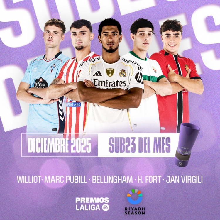 直播吧12月24日讯西甲官方公布了12月最佳U23球员候选名单,贝林厄姆领衔。