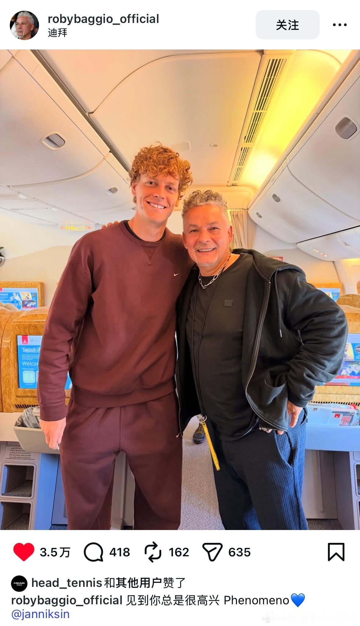 扬尼克·辛纳🤝罗伯特·巴乔哇啊啊啊啊这一波意大利🇮🇹体坛的跨时代联动合影!Jannik和“忧郁王子”巴乔在迪拜飞机上见面了一晃巴乔从足坛退役21年了,当年最早被灌输的几个足球明星就有巴乔的名字!意大利体育的标志性人物真的影响力都蛮强!
