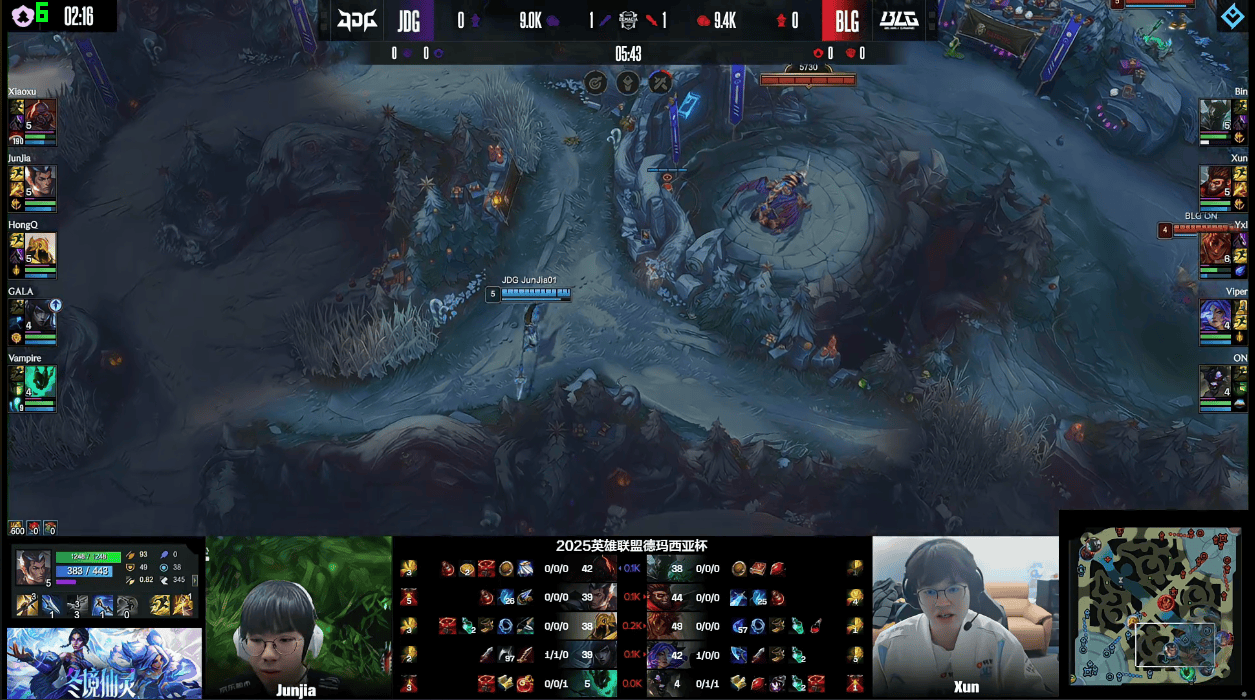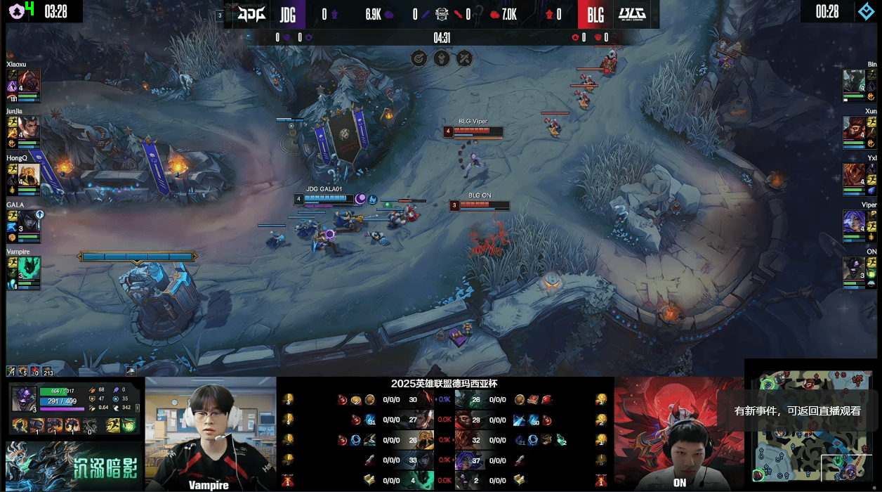 6分钟,BLG野辅深入敌阵排视野,JDG下野三人集火击杀ON