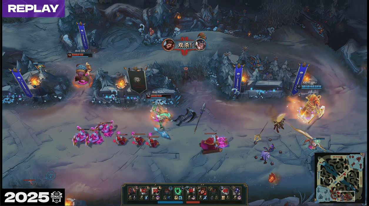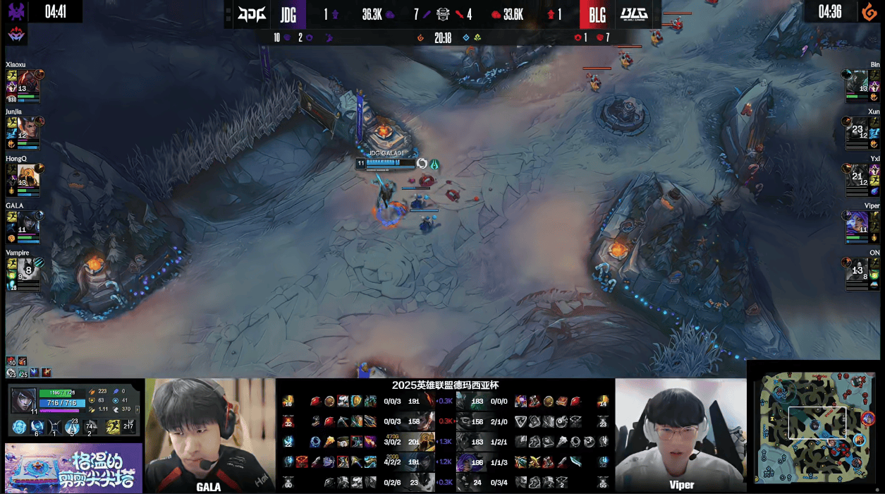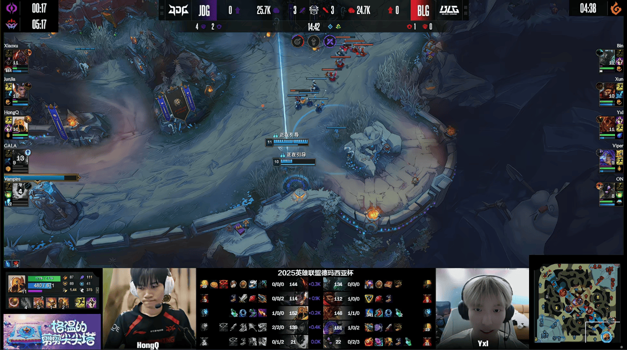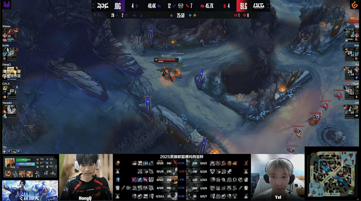 25分钟,双方血拼JDG完成3换4,HongQ沙皇豪取四杀完成超神