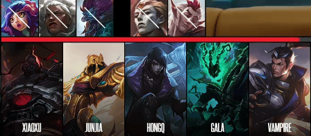JDG选用:Xiaoxu塞恩;Junjia赵信;HongQ沙皇;GALA飞六四;Vampire锤石