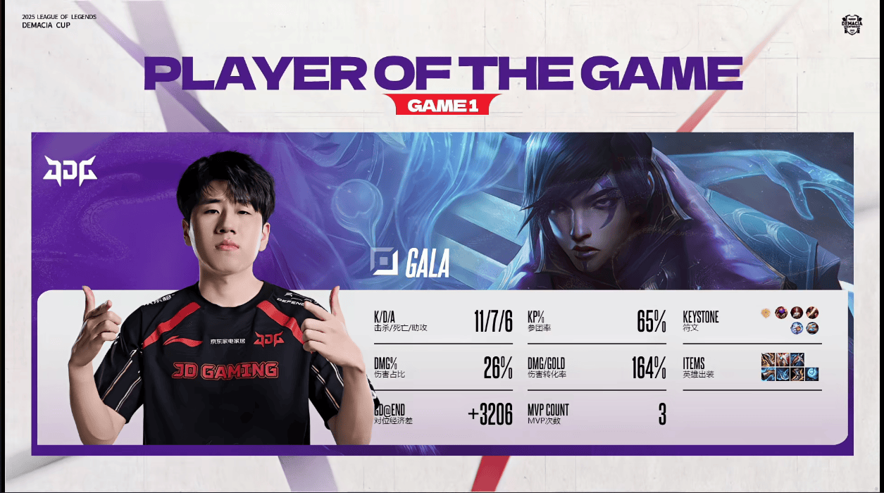 GALA厄斐琉斯打出11/7/6战绩,斩获JDG对阵BLG第一局MVP