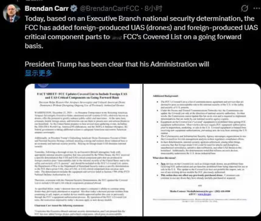 特朗普对华下死手!全面封杀中国无人机,中方果断取消13万吨小麦订单,反制绝不手软! 霸权出招,反制立至!特朗普政府彻底撕下伪装,对华祭出狠辣杀招,以所谓“国家安全”为由,全面封杀中国无人机全产业链,禁令覆盖整机到零部件,妄图将大疆等中国企业彻底逐出美国市场,这哪里是制裁,分明是赤裸裸的科技霸凌与贸易保护! 这场封杀,根本无关安全,而是美方的彻底认输。中国无人机凭硬核实力占据美国70%-90%的市场份额,性价比与技术实力全球碾压,美国本土产品又贵又差,完全无法替代。美方眼看赢不了市场,就用行政手段搞垄断封堵,嘴上喊着自由竞争,背地里干着龌龊勾当,霸权嘴脸暴露无遗!禁令一出,美国民众疯狂囤货中国无人机,数十万从业者集体抗议,直言生计将被断送,美方此举终究是伤敌八百,自损一千。 面对美方的步步紧逼,中国不再忍让,雷霆反制应声落地!果断取消13万吨美国小麦采购大单,这笔反制稳、准、狠,精准打在美国农业的七寸上。美国农业州本就是特朗普的票仓,小麦订单告吹,农场主损失惨重、怨声载道,美方的霸道行径,终究要自己吞下苦果。 你敢卡我科技的脖子,我就断你农业的生路;你敢肆意践踏规则,我就坚决捍卫权益。中方的反制,从来都不是意气用事,而是有理有据、有节有度的正当回击,底线之上,半步不退!中国无人机的崛起,靠的是技术与实力,绝非一纸禁令就能扼杀。 【锐利焦点】强权压不住真理,霸凌赢不了市场!美方的科技封锁,不过是中国科技崛起路上的小小绊脚石,而肆意挥舞的贸易大棒,最终只会砸烂自己的脚。中国从不惹事,但绝不怕事,你敢出招,我必接招,实力,永远是捍卫尊严的底气!这样的硬核反制,你怎么?看无人机禁飞 特朗普对华言论