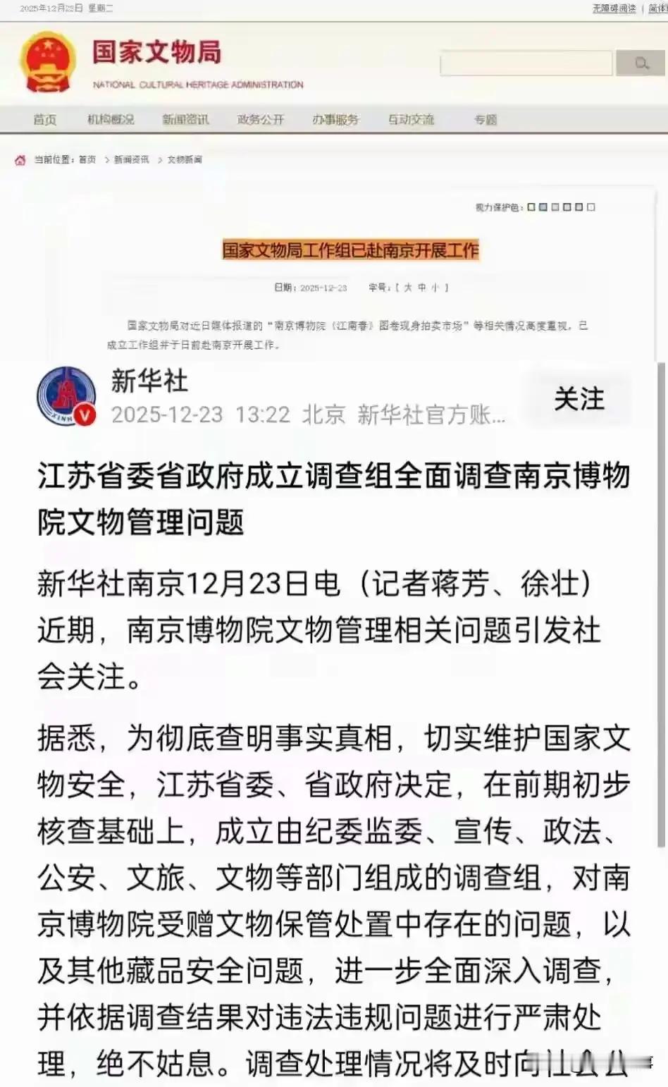 南京博物院事件会不会爆出更大的行业黑幕? 这段时间以来,南京博物院事件持续刷屏。 国家文物局、南京市委市政府成立工作组,对此展开调查。这个事件可能会成为一个标志,能不能让那些不为人知的行业内幕曝光于天下?我们可以拭目以待。 先说这一事件的来龙去脉。 上世纪50年代庞增和先生(庞叔令女士的父亲),捐赠给南京博物院137幅珍贵字画。 2025年5月,庞家后人庞叔令在北京的一拍卖预展上,居然看到了其父亲1959年捐赠给南京博物院的仇英《江南春》图卷,拍卖价高达8800万元。 捐赠的名画怎么会出现在拍卖会上? 庞叔令仔细核对家族留存的捐赠清单、款识与印章后,确认拍卖的是原作,就向文物部门举报,该拍品随即被撤拍。 庞叔令赶紧找到南京博物院,希望核查捐赠的137幅珍贵字画的现状。但南京博物院却告知非捐赠者本人无权查看。 庞叔令向法院提出诉求,求助于法律。6月28日,庞叔令得以前往南京博物院核验。 她现场查看后发现,共5件古画不见踪影,其中就包括《江南春》。 面对庞叔令要求查清真相和舆论谴责,12月17日,南京博物院则声明:这5幅字画早已经过鉴定是赝品,被调剂流转了! 这到底又是怎么一回事?原来,1997年4月15日,南京博物院向原江苏省文化厅提交《关于处理不够馆藏标准文物的报告》,请求“将不够馆藏标准的文物进行调剂,价拨给省文物总店处理”。原江苏省文化厅于4月21日同意调剂。5月8日,被专家认定为赝品的《江南春》图卷拨交给原江苏省文物总店。2001年4月16日,《江南春》被以6800元价格卖掉,销售清单写的是《仿仇英山水卷》,买家是“顾客”。 当时,南京博物院的院长是徐湖平,江苏省文物总店负责人还是徐湖平。这个“顾客”是谁呢?陆庭。 事情显得越来越蹊跷,舆论风暴随即到来。12月23日,国家文物局成立工作组展开调查。 说几点看法; 第一,庞增和是近代大收藏家庞莱臣的长孙,1959年他向南京博物院无偿捐赠了137件(套)虚斋旧藏古画,这是个事实。且不说庞增和的收藏水准,就是捐赠的137件古画中,五分之四后成为南博的一级藏品,这就很能说明问题。 第二,将捐赠品鉴定为赝品,必然有个严格的程序。当时的程序是否合规?是哪些专家参与了鉴定?有没有违规的地方?这是个关键。 第三,博物馆的藏品鉴定为赝品,就一定要调剂流转么?都知道,博物馆里面的收藏并不一定都是真品,但不代表没有价值,完全可以用作研究交流。有些非珍品价值是很高的。 第四,博物馆藏品在调拨的时候,假若捐赠品是假的,是否应该退还?即使是流转,是不是应该告知捐赠方一声?这是对捐赠方的尊重。随便流转处理,还悄悄地卖掉,是不是不合适? 第五,先不说当时捐赠的是否是真品,那么高质量的“赝品”2001年仅卖6800元,显然与当时的行情是不符的。 第六,为什么购买者的名字写的是“顾客”?按照规矩,购买者应该输真名,除非此人姓顾名客,但是,报道说购买者为徐湖平的好朋友陆挺,那当时为什么不写真名? 总之,有很多网友说博物馆收藏在以前就曾经出现过监守自盗、偷梁换柱的事件,这个南博事件当中有没有存在这种现象?不得而知。其他博物馆有没有这种现象?同样不得而知。这次南博事件后续会怎么发展?现在,国家和南京都已经成立了调查组,相信肯定不会轻易收场,必然会查出一个结论,给公众一个交代南京博物院 南京国家文物 南京愽物馆 南京博物馆印章 博物南京