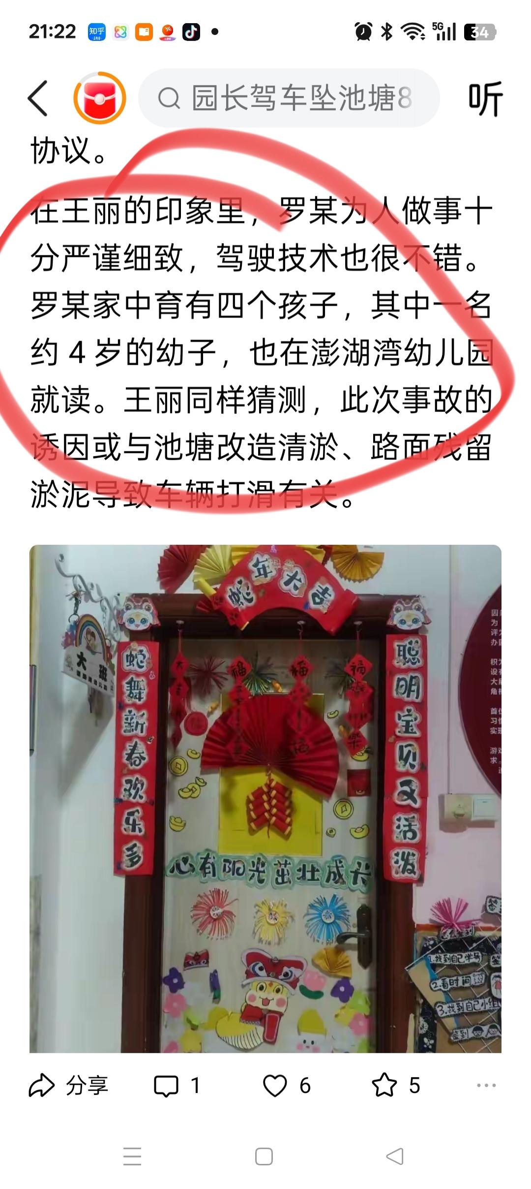 彭泽澎湖湾幼儿园,罗细红园长,本是一番好意,由于校车座位不足,她主动帮忙接送。她驾驶的技术也很成熟,只可惜当天水塘边有人清理淤泥,所以导致马路上也留了一些淤泥。她的朋友猜测:估计是当时下着雨,加上遇到淤泥,打滑所致。 罗细红园长为人很热情,有4个孩子,最小的4岁孩子也在自己的幼儿园读书。经过几年的努力,她的客户源稳定,幼儿园总面积达到了2000平方米,还配备了舞蹈室,阅读室,保健室,和8个幼儿园老师,可以说很成熟了。 看了一下现场的图片,路面比较窄,如果有淤泥没有及时清理,确实有打滑的可能性,可惜了[祈祷][祈祷] 信息来源于九派教育
