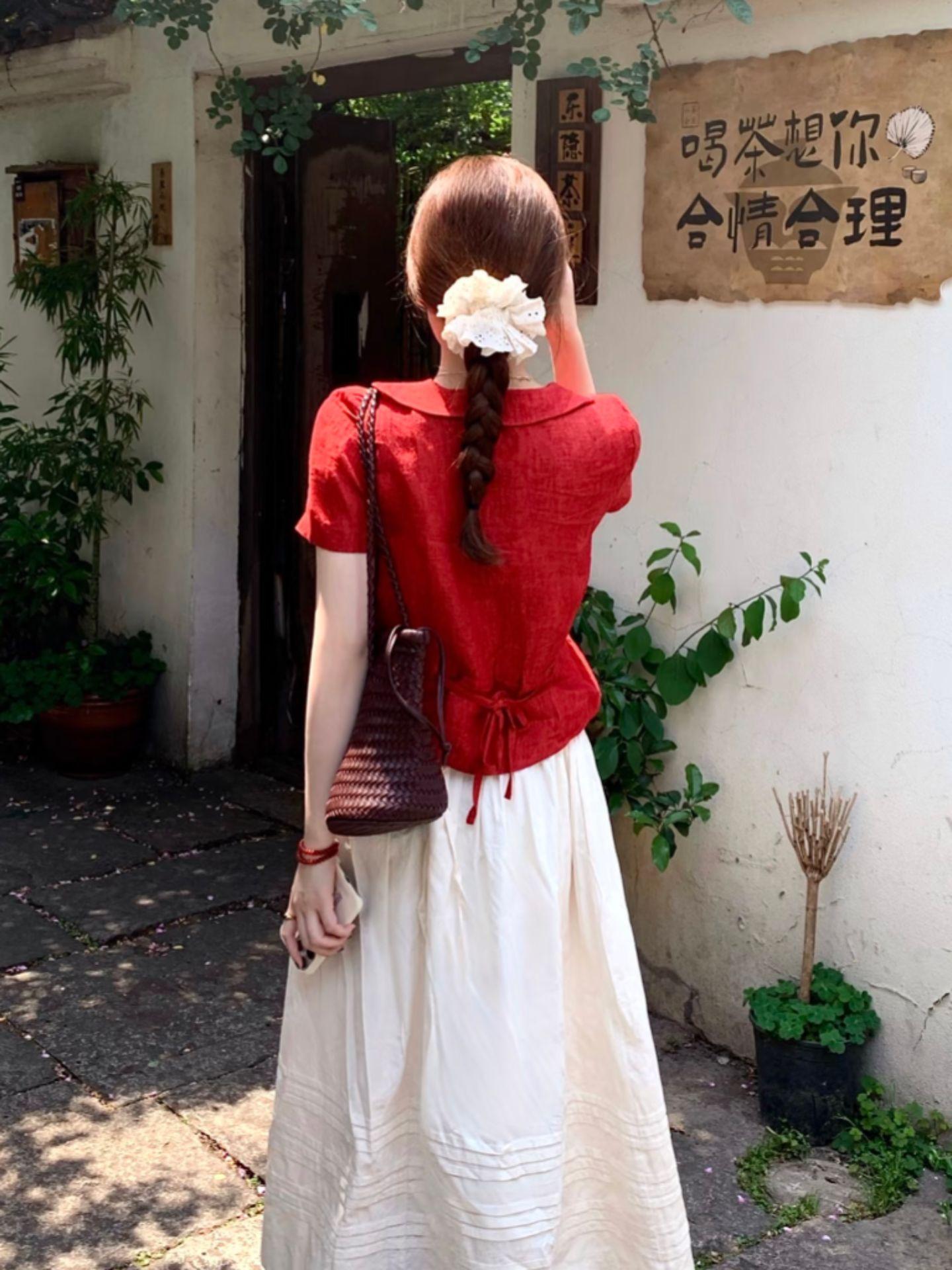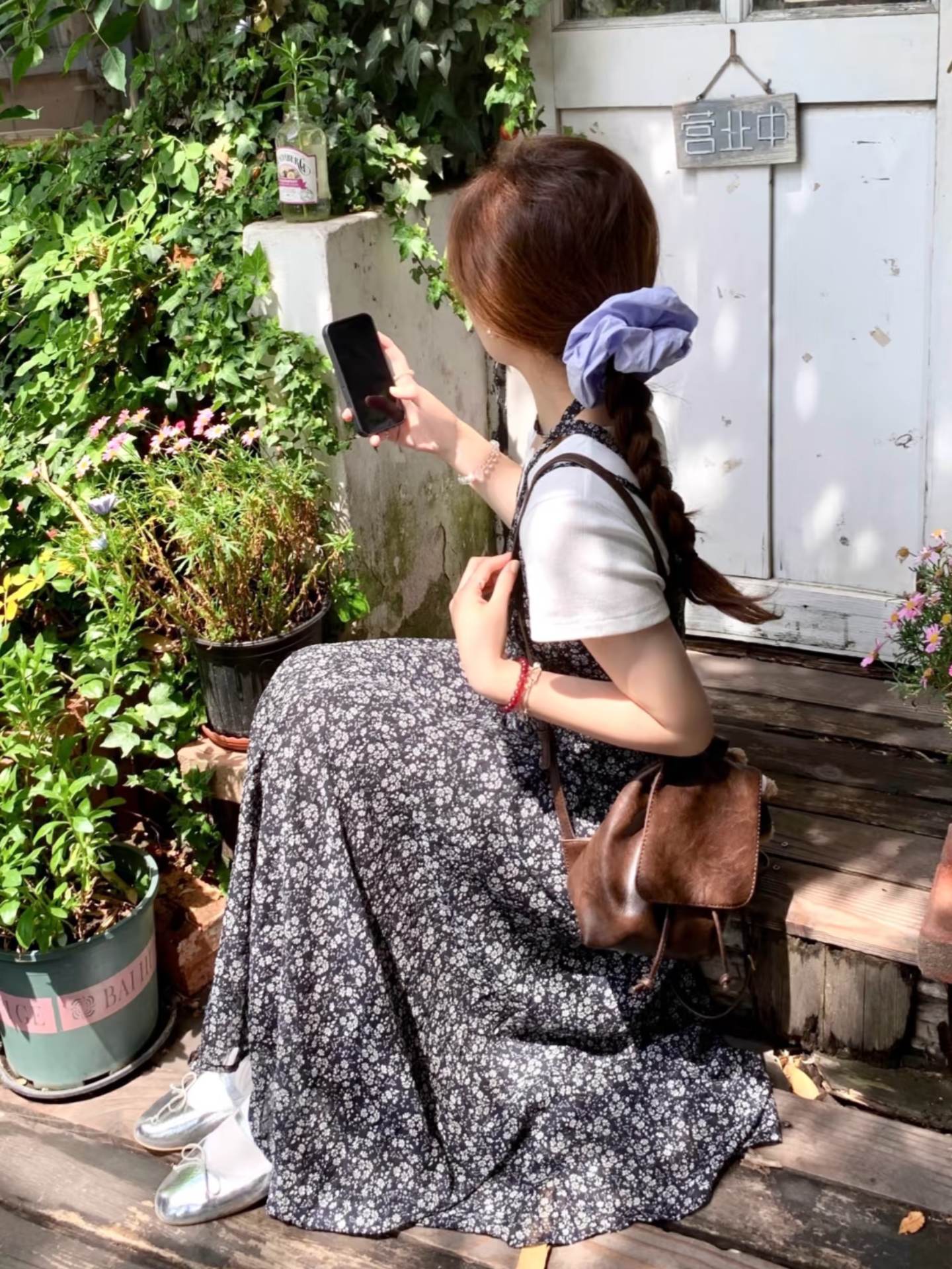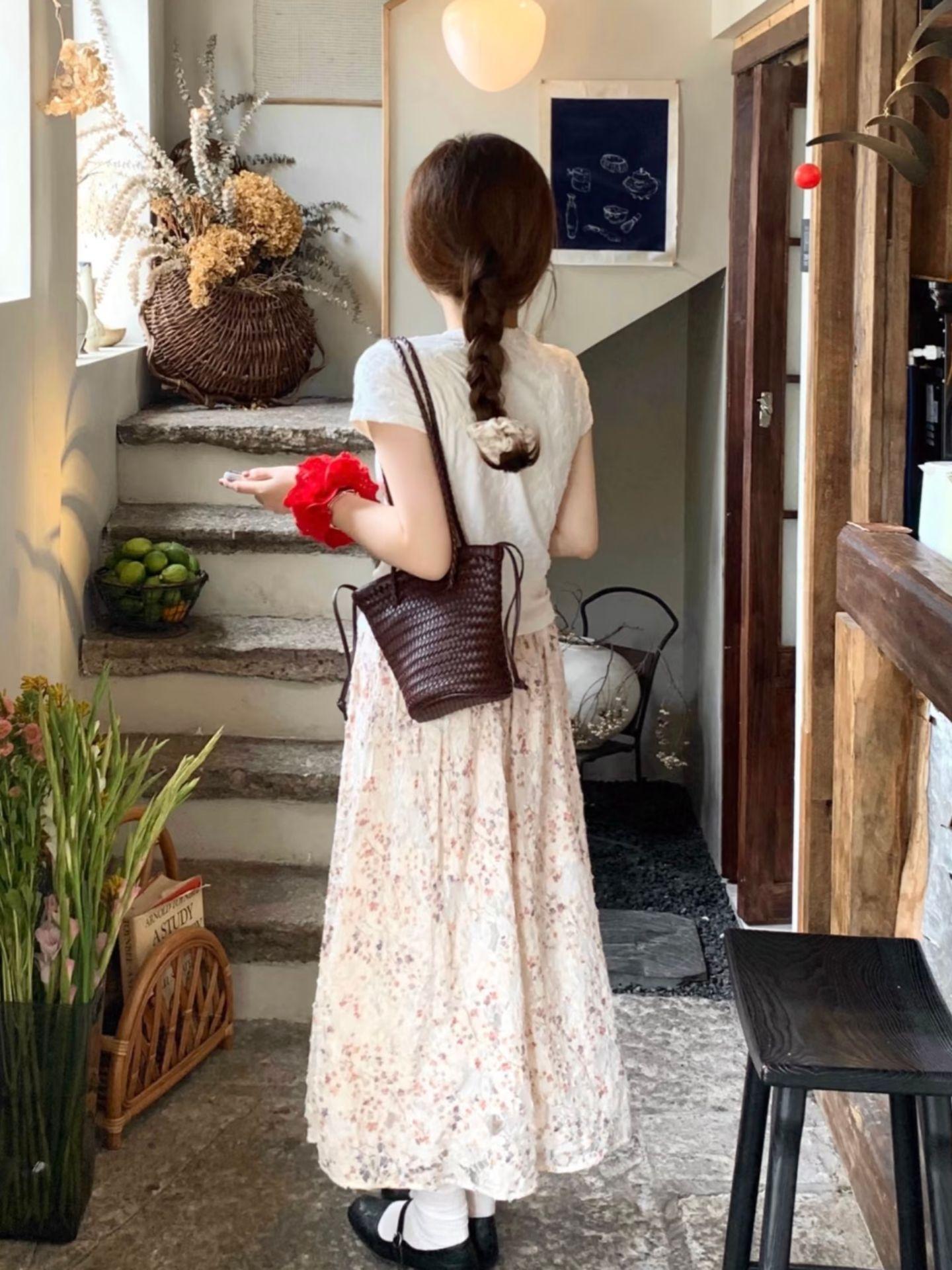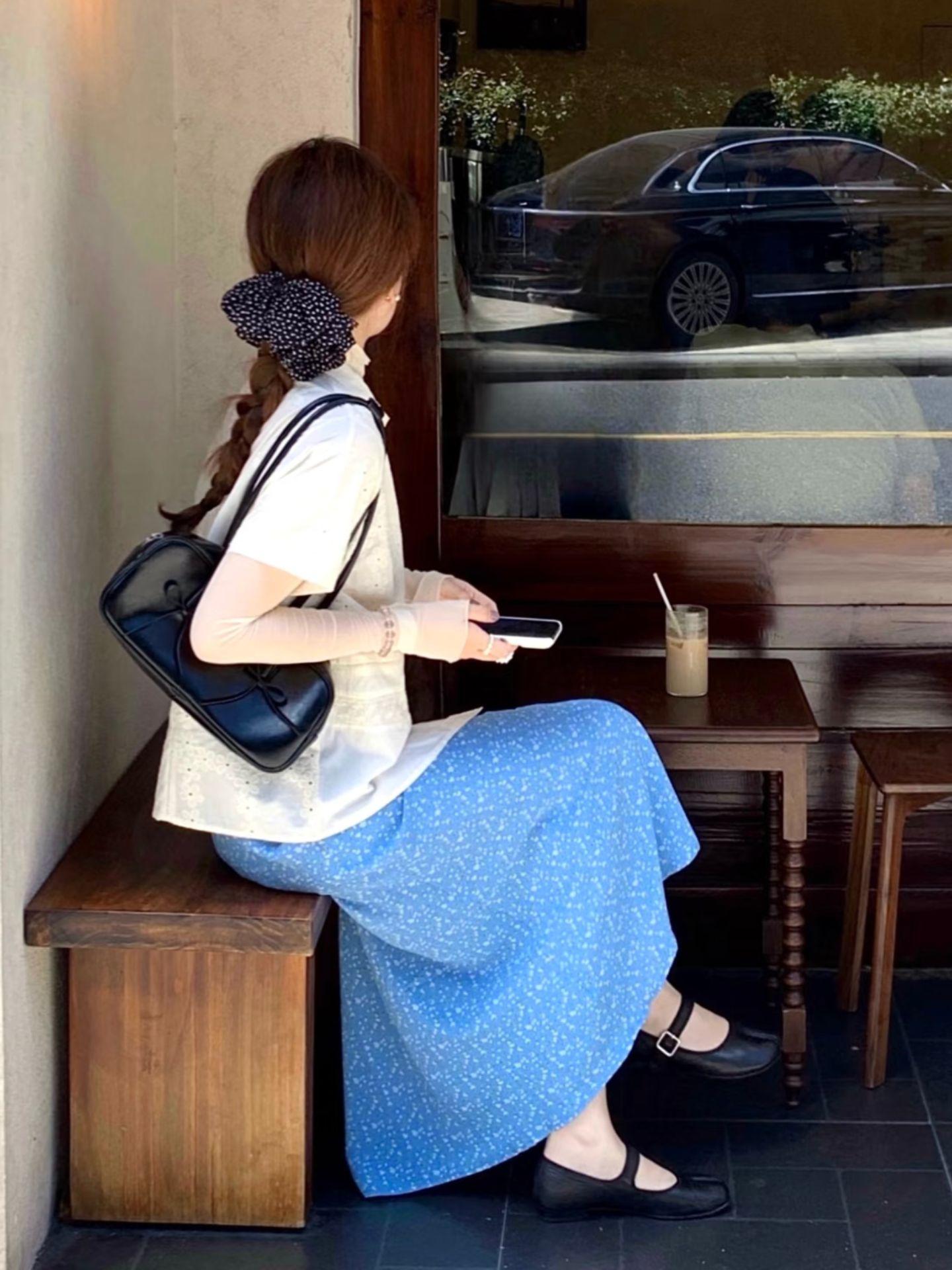 白色短袖搭黑色蕾丝裙,配白色细跟鞋,优雅温婉气质出众。