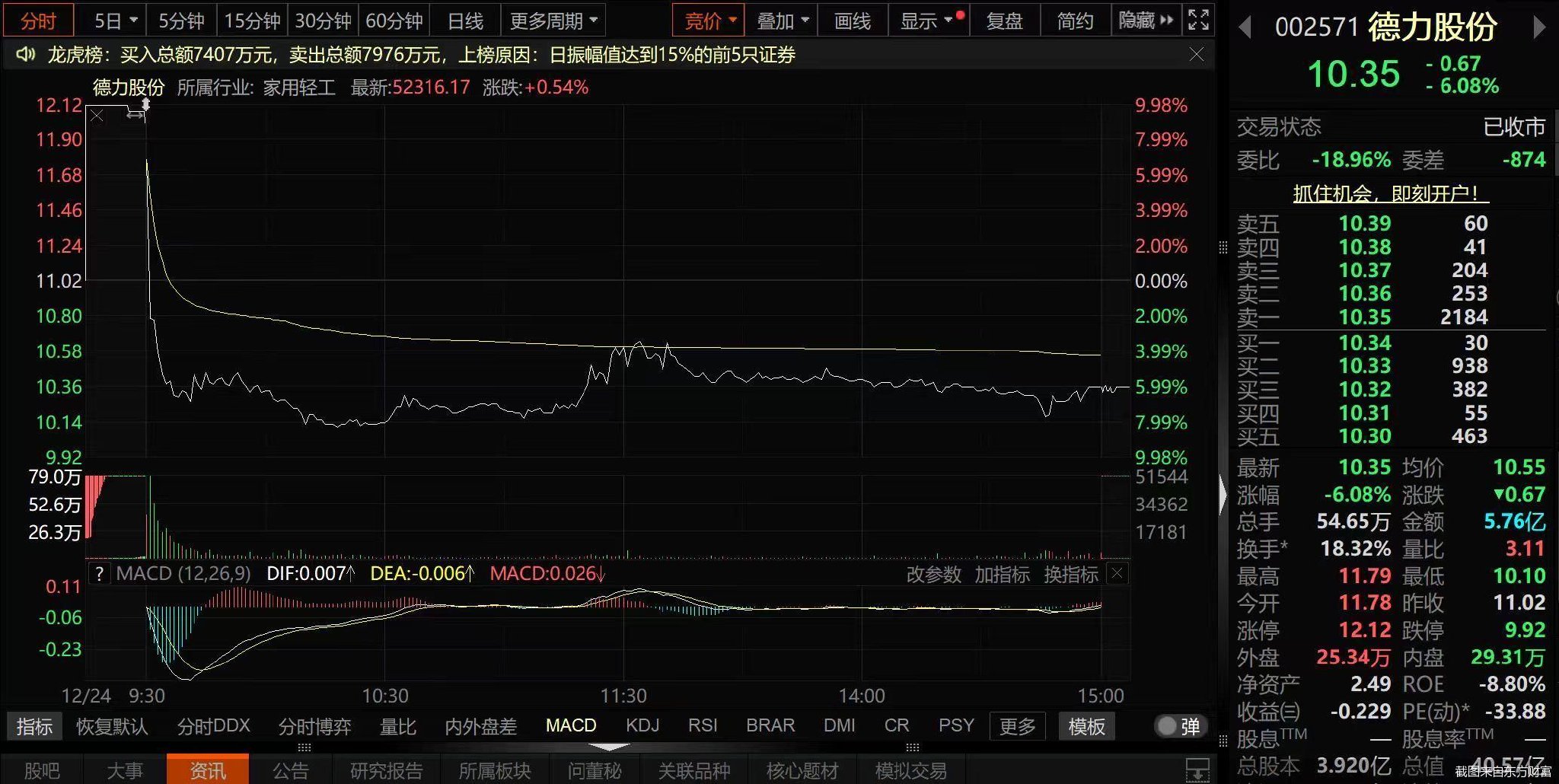12月24日,德力股份股价高开6.9%,开于11.78元/股,不过开盘后公司股价跳水翻绿,盘中一度跌超8%,截至收盘,公司股价收跌6.08%,收于10.35元/股,最新总市值约40.57亿元,当日成交金额约5.76亿元。