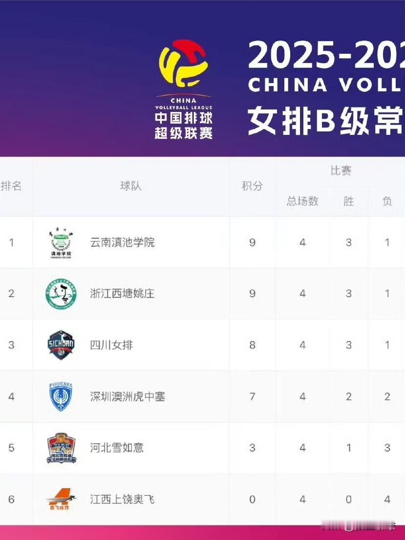 今天津苏大战五局,非常激烈,天津女排小将敢打敢拼,值得点赞,虽败犹荣。江苏女排前两局上范泊宁还是有不足,换上唐欣、郭中楠后,阵容不足得以弥补,连胜三局逆转。 B级联赛也是撕的很激烈啊,双外援的深圳只排名第四,江西更是垫底。不过目前看了几场比赛看到的水平基本是打不过河南福建辽宁的。 2025-2026中国排球超级联赛排超联赛四轮过后,积分榜 上海女排:4战4胜,积12分,得失局12:1 山东女排:3胜1负,积10分,得失局11:4 北京女排:3胜1负,积9分,得失局11:6 江苏女排:3胜1负,积8分,得失局9:6 天津女排:2胜2负,积6分,得失局9:8 福建女排:1胜3负,积3分,得失局3:9 河南女排:4战4负,积0分,得失局3:12 辽宁女排:4战4负,积0分,得失局0:12