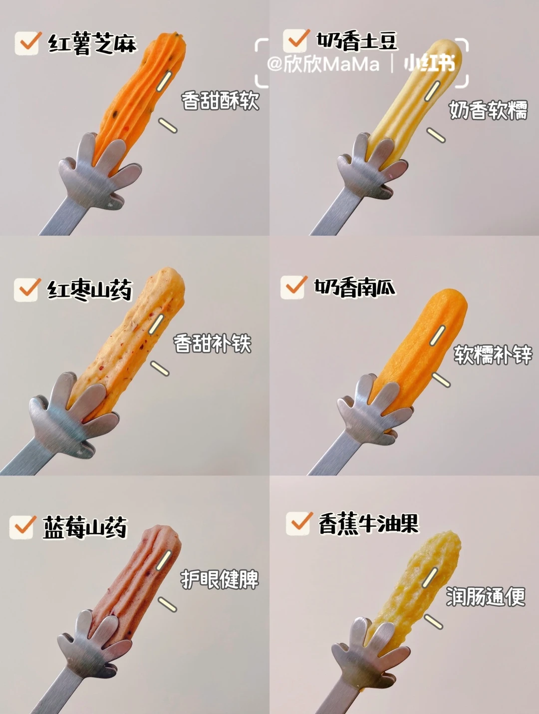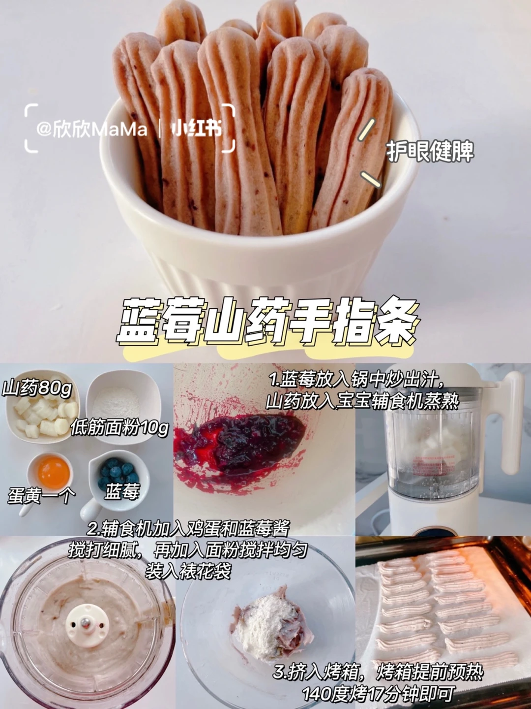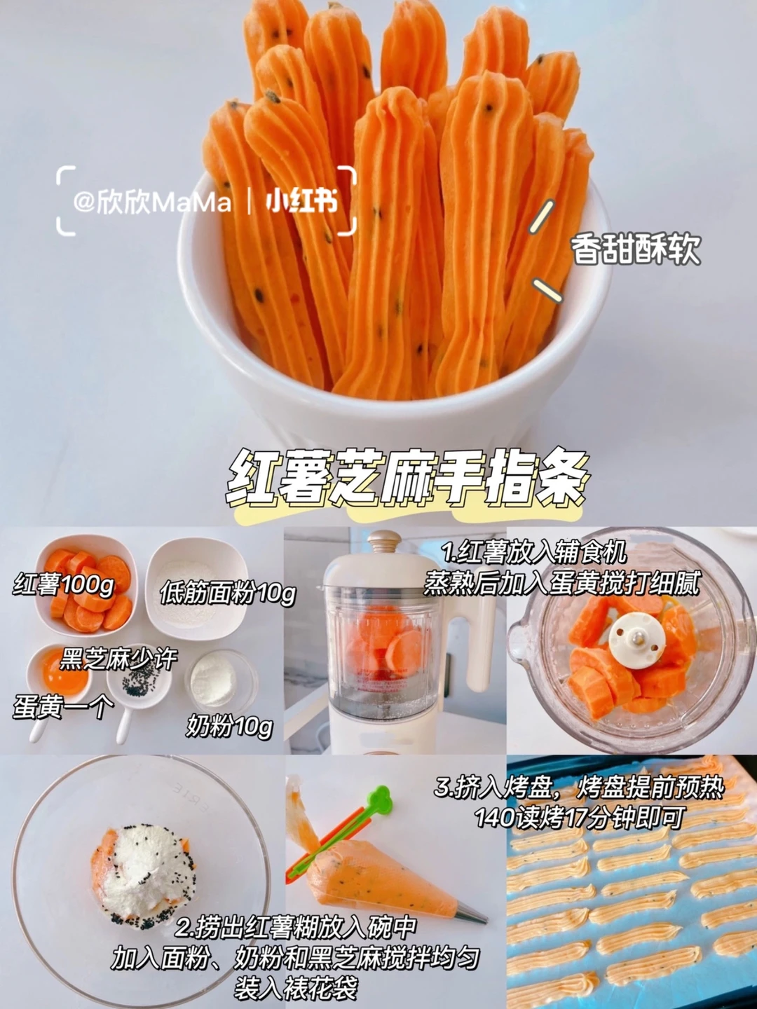 今天分享的6款宝宝软饼干,口感软糯香甜好吃!我家小欣欣一口接一口~满满地的喜欢~ 是很棒的哄娃小零食~无油无糖~并且可以锻炼宝宝的咀嚼能力和抓握能力,做法简单~妈妈们安排上喔😃! 〰️ 🔸红薯芝麻手指条 🛒食材:红薯100g、低筋面粉10g、黑芝麻少量、蛋黄一个、奶粉10g 👩‍🍳做法:红薯蒸熟放入辅食机搅打成泥。红薯泥放入碗中,加入面粉,蛋黄和奶粉搅拌均匀装入裱花袋,挤入烤盘,烤箱提前预热,140度烤17分钟即可 . 🔸奶香土豆手指条 🛒食材:土豆100g、奶粉10g、蛋黄一个、低筋面粉15g 👩‍🍳做法:土豆蒸熟放入辅食机搅打成泥。土豆泥放入碗中,加入面粉,蛋黄和奶粉搅拌均匀装入裱花袋,挤入烤盘,烤箱提前预热,140度烤17分钟即可 . 🔸 奶香南瓜手指条 🛒食材:南瓜100g、奶粉10g、蛋黄一个、低筋面粉30g 👩‍🍳做法:南瓜蒸熟放入辅食机搅打成泥。南瓜泥放入碗中,加入面粉,蛋黄和奶粉搅拌均匀装入裱花袋,挤入烤盘,烤箱提前预热,140度烤17分钟即可 . 🔸 红枣山药手指条 🛒食材:山药80g、红枣5个、蛋黄一个、低筋面粉10g 👩‍🍳做法:山药蒸熟放入辅食机加入蛋黄和红枣片搅打成泥。红枣山药泥放入碗中,加入面粉,搅拌均匀装入裱花袋,挤入烤盘,烤箱提前预热,140度烤17分钟即可 . 🔸 蓝莓山药手指条 🛒食材:山药80g、低筋面粉10g、蛋黄一个、蓝莓适量 👩‍🍳做法:蓝莓放入锅中炒出汁,山药蒸煮放入辅加入鸡蛋和蓝莓酱搅打细腻,再加入面粉搅拌均匀装入裱花袋,挤入烤盘,烤箱提前预热,140度烤17分钟即可 . 🔸 香蕉牛油果手指条 🛒食材:香蕉半根、牛油果半个、低筋面粉10g、配方奶30ml 👩‍🍳做法:除了面粉外其他食材倒入辅食机搅打细腻,香蕉牛油果泥放入碗中加入面粉搅拌均匀,挤入烤盘,烤箱提前预热,140度烤17分钟即可 〰️ ⚠️鸡蛋过敏可以不放 ⚠️每个烤箱的脾气不同,大家根据自家烤箱情况略微调整 做法简单,又营养好吃!妈妈们快收藏起来哦! . 有疑问🤔️也可以评论区留言喔😄 💡关注我带您解锁更多辅食制作。