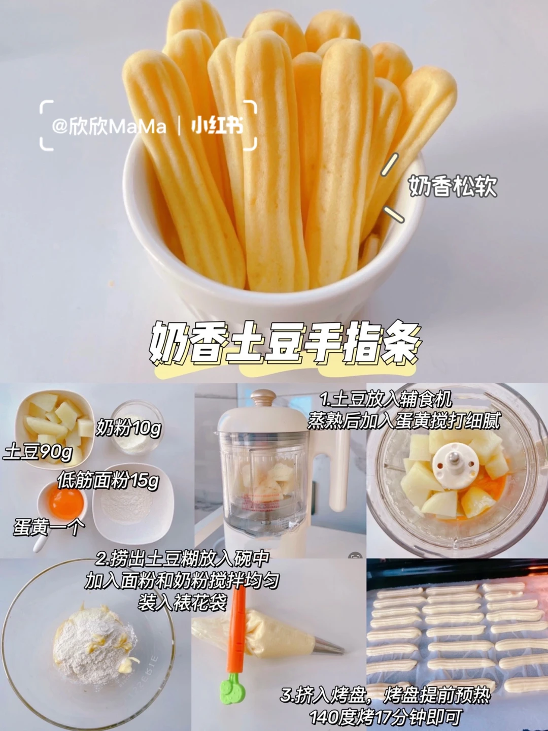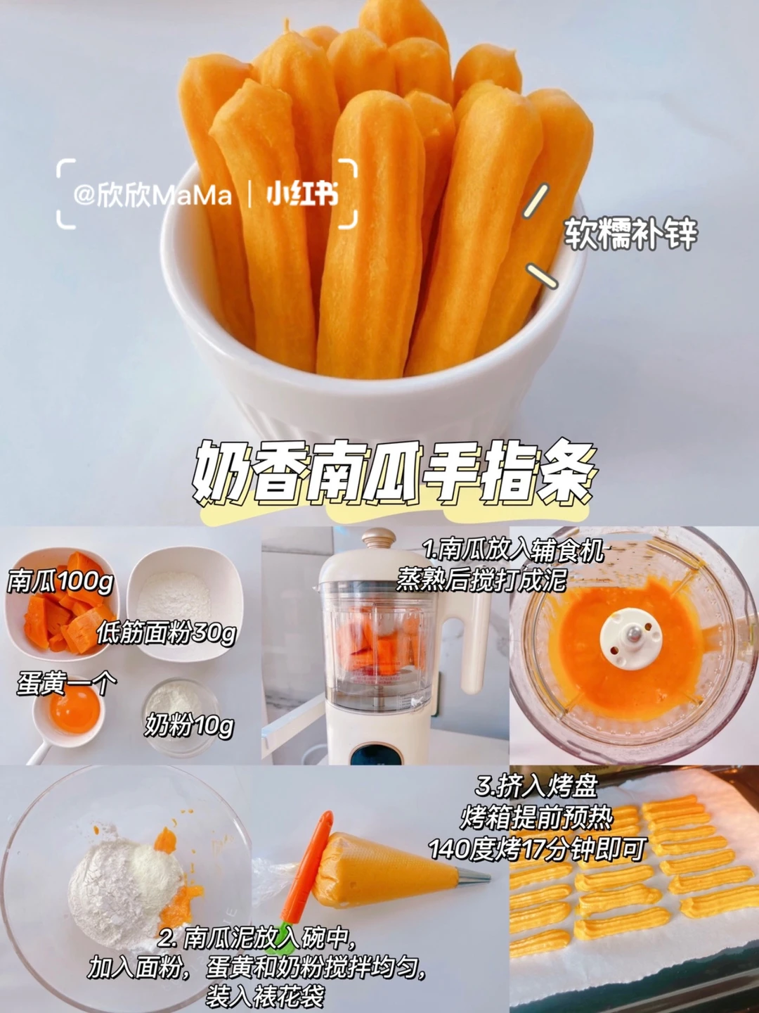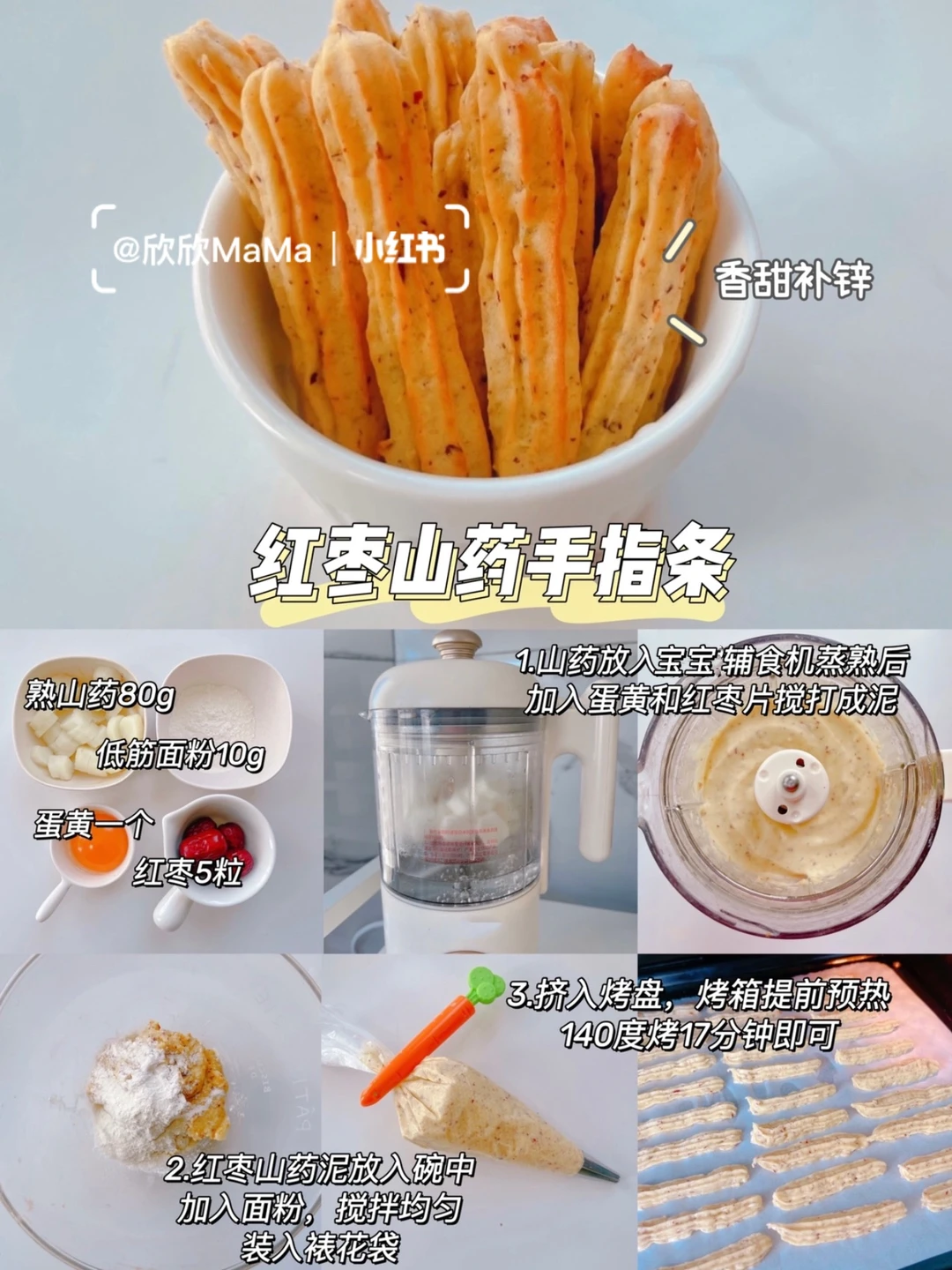 今天分享的6款宝宝软饼干,口感软糯香甜好吃!我家小欣欣一口接一口~满满地的喜欢~ 是很棒的哄娃小零食~无油无糖~并且可以锻炼宝宝的咀嚼能力和抓握能力,做法简单~妈妈们安排上喔😃! 〰️ 🔸红薯芝麻手指条 🛒食材:红薯100g、低筋面粉10g、黑芝麻少量、蛋黄一个、奶粉10g 👩‍🍳做法:红薯蒸熟放入辅食机搅打成泥。红薯泥放入碗中,加入面粉,蛋黄和奶粉搅拌均匀装入裱花袋,挤入烤盘,烤箱提前预热,140度烤17分钟即可 . 🔸奶香土豆手指条 🛒食材:土豆100g、奶粉10g、蛋黄一个、低筋面粉15g 👩‍🍳做法:土豆蒸熟放入辅食机搅打成泥。土豆泥放入碗中,加入面粉,蛋黄和奶粉搅拌均匀装入裱花袋,挤入烤盘,烤箱提前预热,140度烤17分钟即可 . 🔸 奶香南瓜手指条 🛒食材:南瓜100g、奶粉10g、蛋黄一个、低筋面粉30g 👩‍🍳做法:南瓜蒸熟放入辅食机搅打成泥。南瓜泥放入碗中,加入面粉,蛋黄和奶粉搅拌均匀装入裱花袋,挤入烤盘,烤箱提前预热,140度烤17分钟即可 . 🔸 红枣山药手指条 🛒食材:山药80g、红枣5个、蛋黄一个、低筋面粉10g 👩‍🍳做法:山药蒸熟放入辅食机加入蛋黄和红枣片搅打成泥。红枣山药泥放入碗中,加入面粉,搅拌均匀装入裱花袋,挤入烤盘,烤箱提前预热,140度烤17分钟即可 . 🔸 蓝莓山药手指条 🛒食材:山药80g、低筋面粉10g、蛋黄一个、蓝莓适量 👩‍🍳做法:蓝莓放入锅中炒出汁,山药蒸煮放入辅加入鸡蛋和蓝莓酱搅打细腻,再加入面粉搅拌均匀装入裱花袋,挤入烤盘,烤箱提前预热,140度烤17分钟即可 . 🔸 香蕉牛油果手指条 🛒食材:香蕉半根、牛油果半个、低筋面粉10g、配方奶30ml 👩‍🍳做法:除了面粉外其他食材倒入辅食机搅打细腻,香蕉牛油果泥放入碗中加入面粉搅拌均匀,挤入烤盘,烤箱提前预热,140度烤17分钟即可 〰️ ⚠️鸡蛋过敏可以不放 ⚠️每个烤箱的脾气不同,大家根据自家烤箱情况略微调整 做法简单,又营养好吃!妈妈们快收藏起来哦! . 有疑问🤔️也可以评论区留言喔😄 💡关注我带您解锁更多辅食制作。