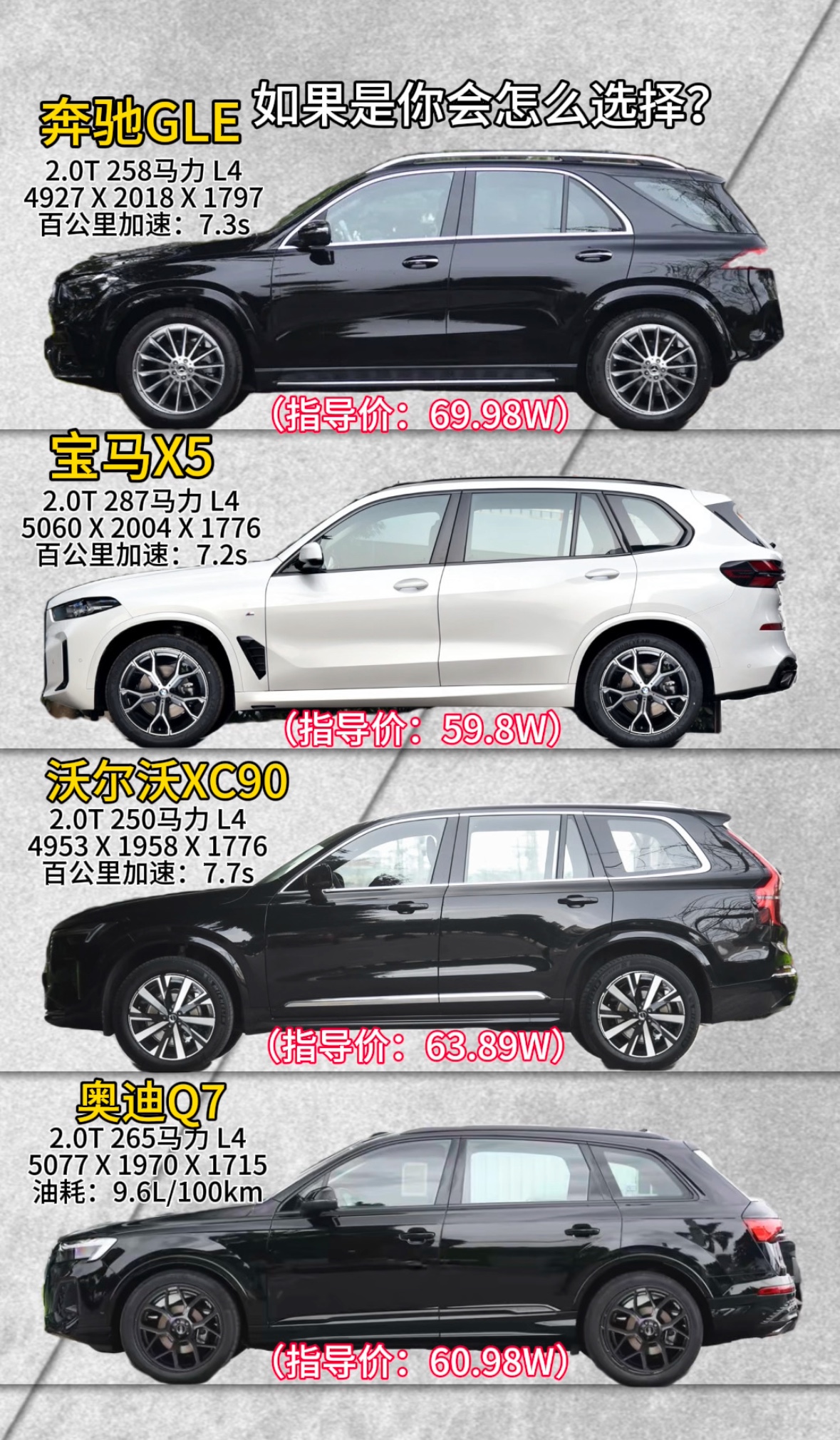 豪华中大型SUV的抉择:四款德系标杆怎么选? 在豪华中大型SUV市场,奔驰GLE、宝马X5、沃尔沃XC90与奥迪Q7始终是绕不开的选择。奔驰GLE以69.98万指导价居首,2.0T发动机输出258马力,7.3秒破百的表现兼顾了品牌豪华感与动力;宝马X5则是性价比与性能的代表,59.8万的指导价搭配287马力的2.0T引擎,7.2秒的零百加速在四款车中最为亮眼,车身尺寸也更修长。 沃尔沃XC90主打安全属性,63.89万的定价下,250马力的动力虽稍弱,7.7秒的加速表现也偏沉稳,却契合其家用定位;奥迪Q7以60.98万定价卡位,265马力的输出与9.6L/100km的油耗数据,展现了均衡的机械素质。 选车的核心终究看需求:追求品牌格调选GLE,偏爱操控与性价比选X5,注重安全家用选XC90,想要均衡实用则选Q7。