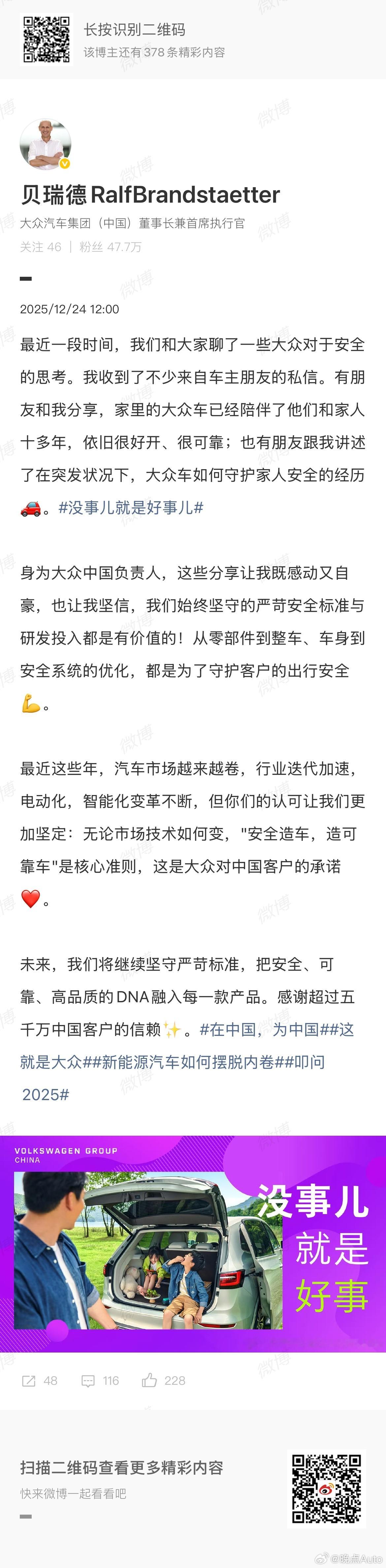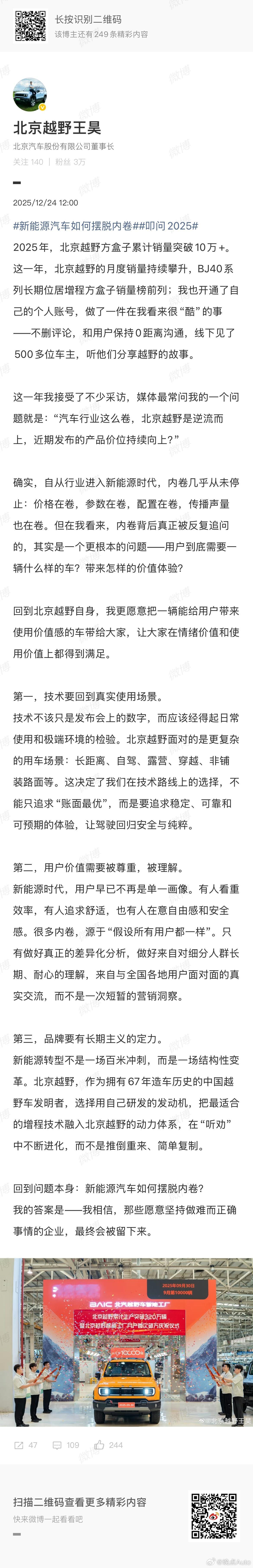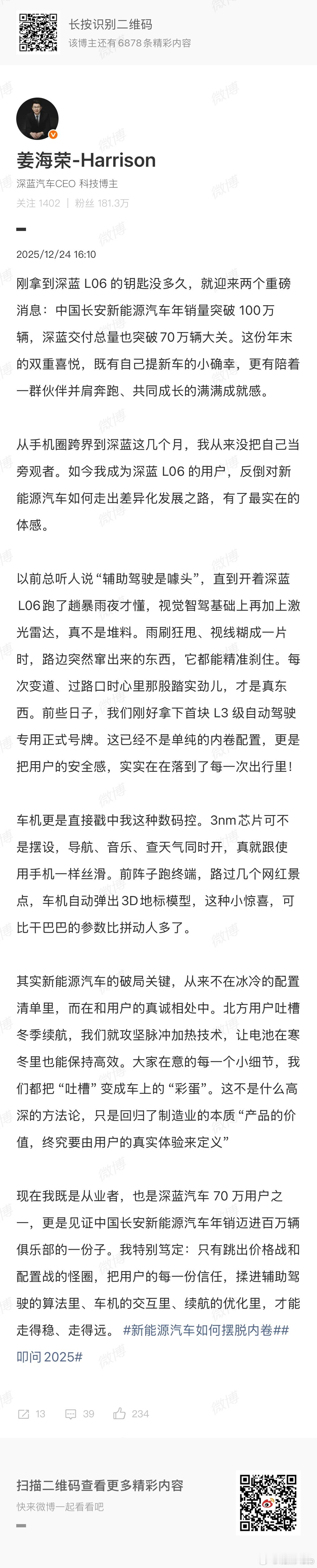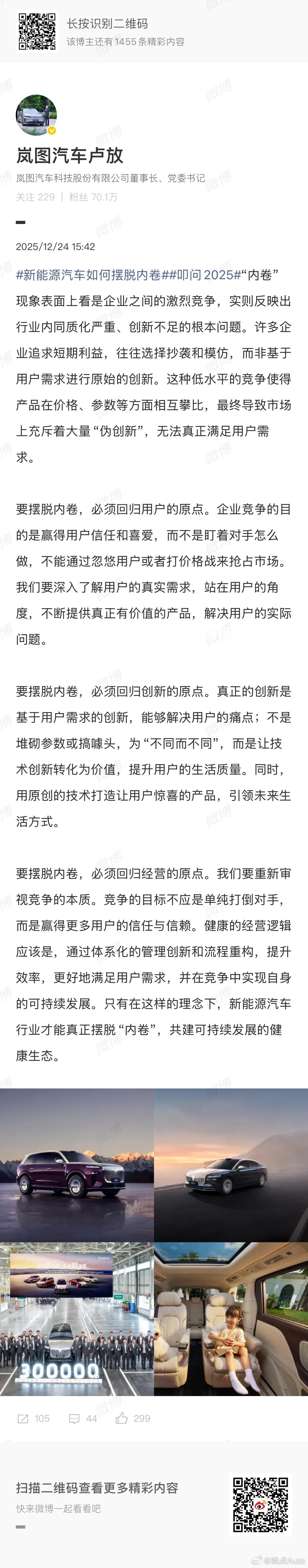 中国自主品牌、新势力的崛起背后是更先进的生产力,但同样生长起来的,还有激烈的内卷生态。在当前市场竞争格局下,每一家车企都需要在价格与利润之间寻找微妙的平衡。新能源汽车如何摆脱内卷,重新定位价值?看看车企高管们怎么说:在大众汽车董事长看来,虽然汽车市场越来越卷,行业迭代加速,电动化,智能化变革不断,大众始终坚定的是,无论市场技术如何变,"安全造车,造可靠车"是核心准则。北京汽车股份有限公司董事长认为:很多内卷,源于“假设所有用户都一样”。只有做好真正的差异化分析,做好来自对细分人群长期、耐心的理解,来自与全国各地用户面对面的真实交流,而不是一次短暂的营销洞察。深蓝汽车CEO称,在只有跳出价格战和配置战的怪圈,把用户的每一份信任,揉进辅助驾驶的算法里、车机的交互里、续航的优化里,才能走得稳、走得远。岚图汽车董事长觉得,要摆脱内卷,必须回归创新的原点。真正的创新是基于用户需求的创新,能够解决用户的痛点;不是堆砌参数或搞噱头,为“不同而不同”。深蓝汽车董事长的答案之一是走向全球,深蓝不仅想把车卖出去,更希望把中国的技术、体验和品牌带到世界。