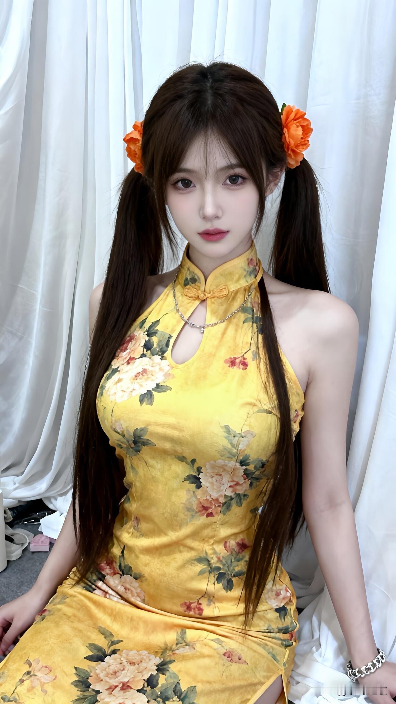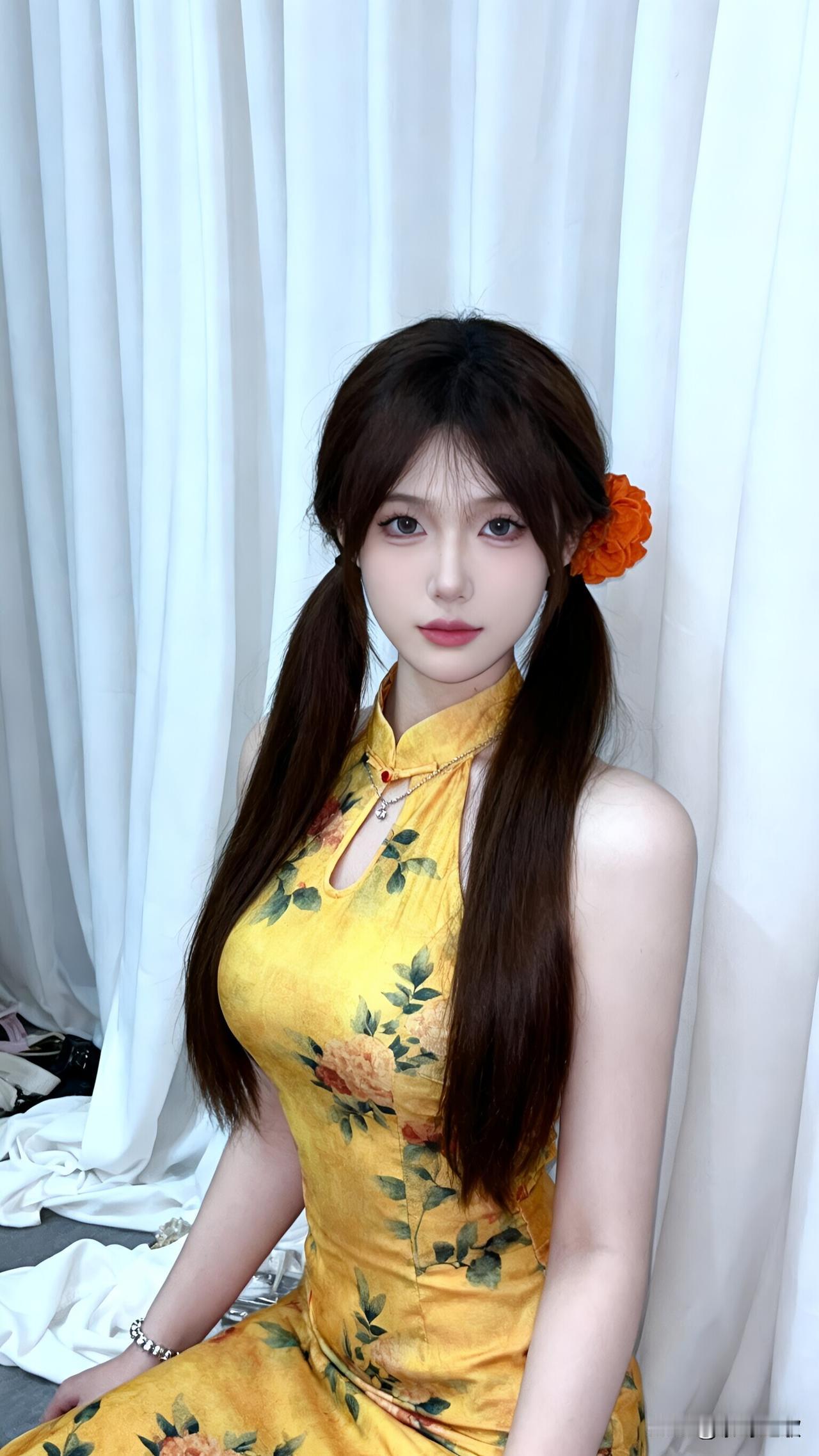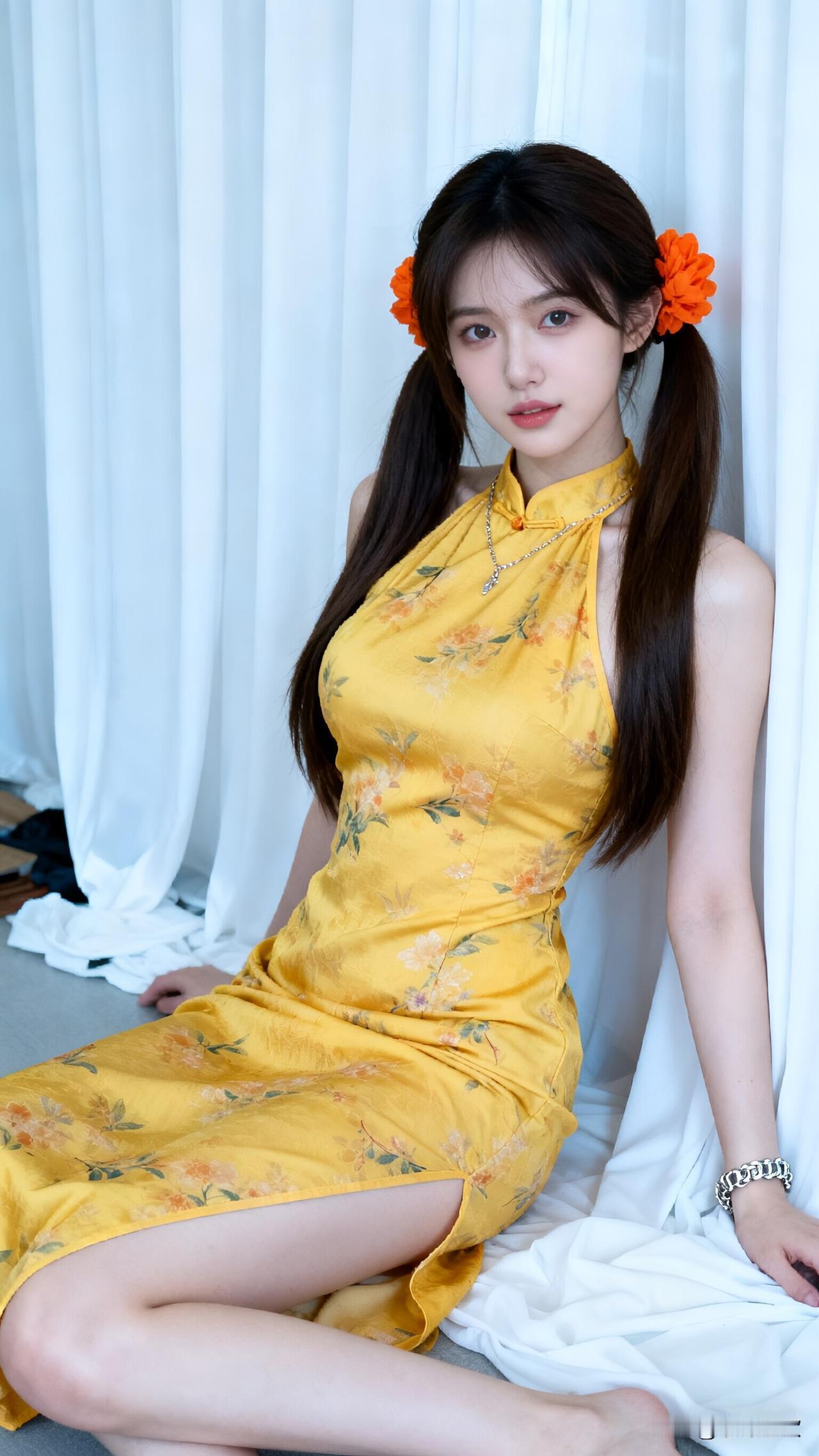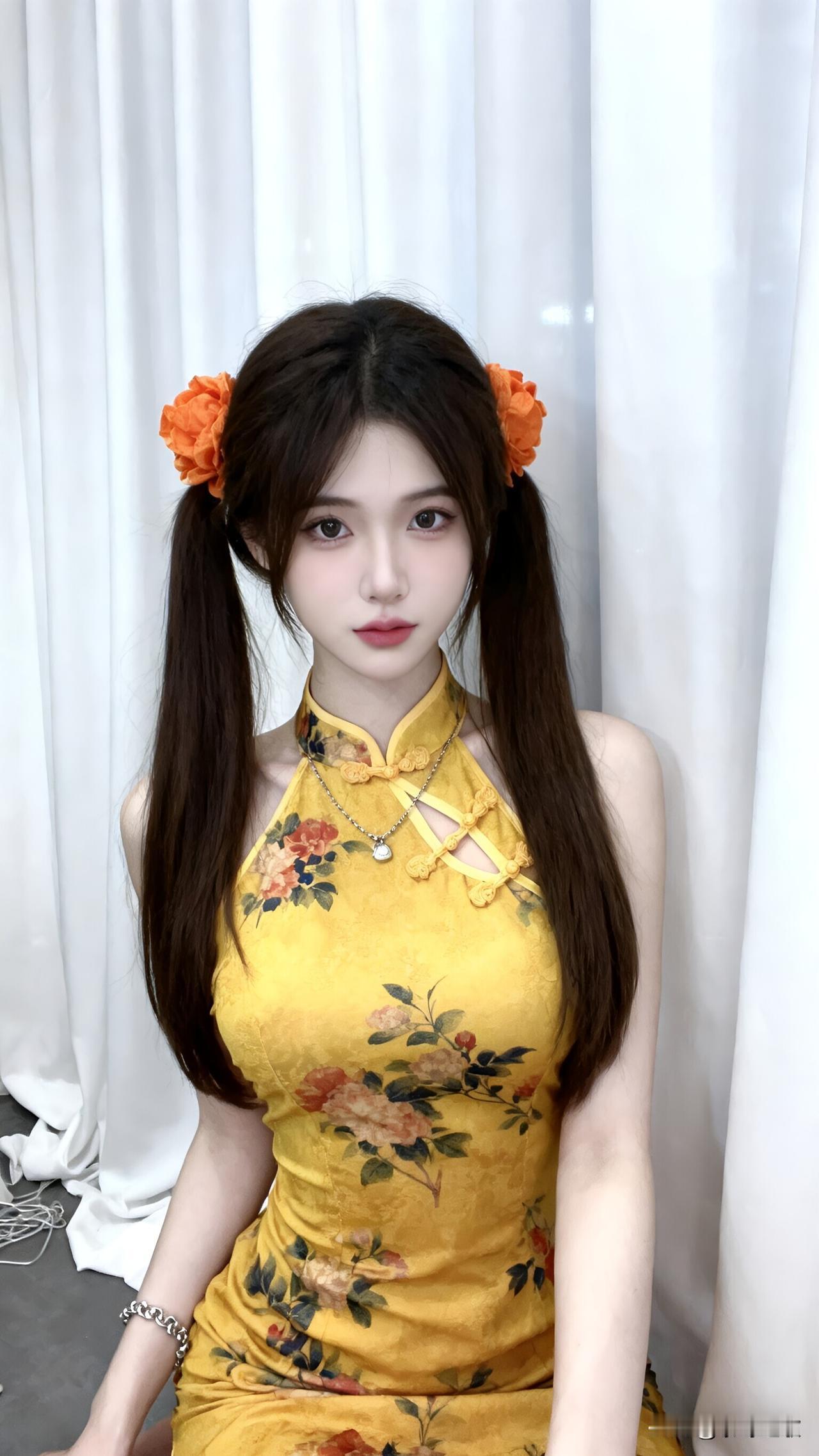 黄碎花旗袍配双马尾,妥妥国风甜妹! 今天在家拍穿搭,穿了这条黄色碎花挂脖旗袍,还扎了双马尾配橙色发花,本来只是想试试甜妹风,结果拍出来的效果直接惊到我!明黄色的旗袍超显白,碎花图案添了几分温婉,挂脖设计又露了点小性感,双马尾还中和了旗袍的成熟感。 发了张照片到姐妹群,她们都说我像从国风漫画里走出来的甜妹,还让我多拍几张当头像。在白色窗帘前拍,黄白配色超清新,氛围感拉满,我已经决定下次去古风馆拍照就这么搭! 黄色旗袍 碎花旗袍 国风甜妹 双马尾造型