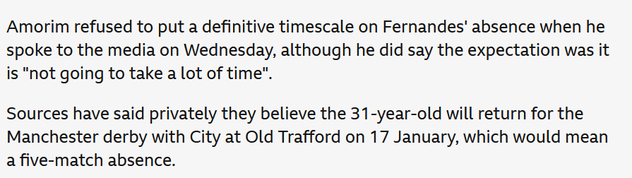 BBC Simon Stone有消息人士私下表示,他们相信布鲁诺费尔南德斯将在 1 月 17 日的曼彻斯特德比中复出,这意味着他将缺席未来五场比赛。