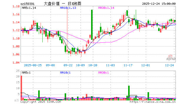 12月24日,大盘价值ETF(159391)跌0.26%,成交额113.76万元。当日份额减少1300.00万份,最新份额为1.96亿份,近20个交易日份额减少6200.00万份。最新资产净值计算值为2.24亿元。