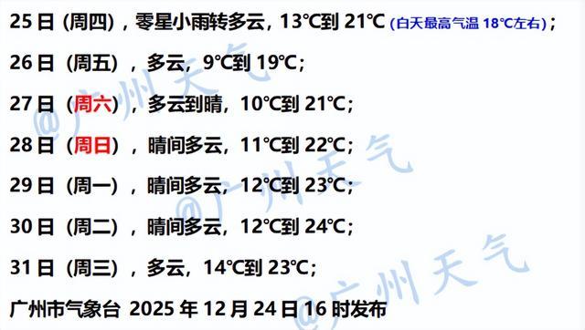 25日,粤北和珠三角中北部市县分散小雨转阴天到多云,其余大部分市县多云到阴天,有分散小雨。最低气温:粤北大部市县8~11℃,南部沿海市县14~18℃,其余市县12~14℃。