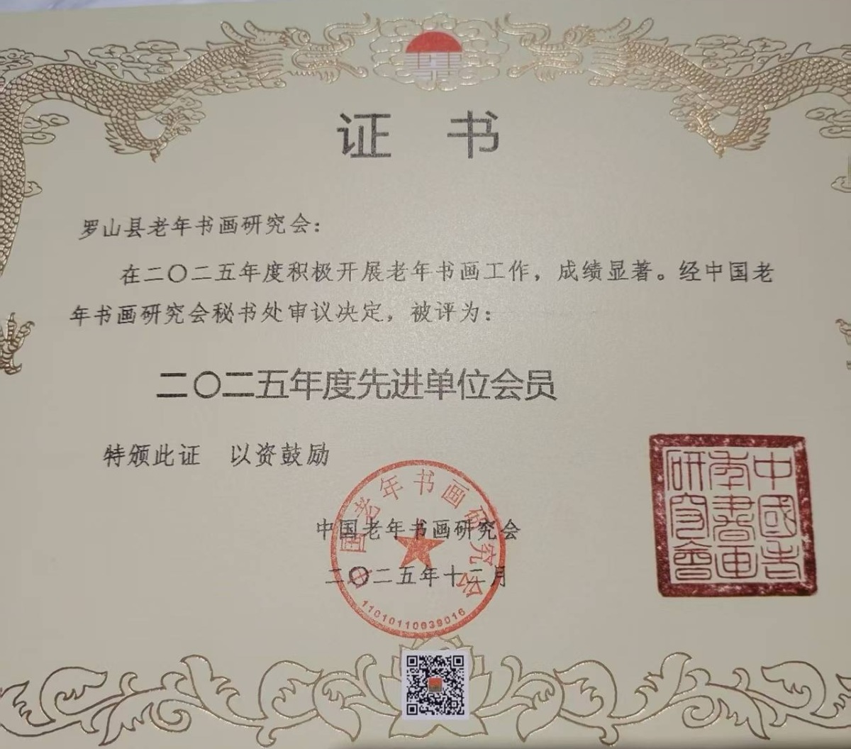 近日,信阳市罗山县老年书画研究会在中国老年书画研究会第五届第五次理事大会暨“壮心不已”书画展上荣获“2025年度先进单位会员”称号。这是该研究会第三次获得此项国家级荣誉,同时也是本次河南省唯一获此殊荣的县级理事会员单位。