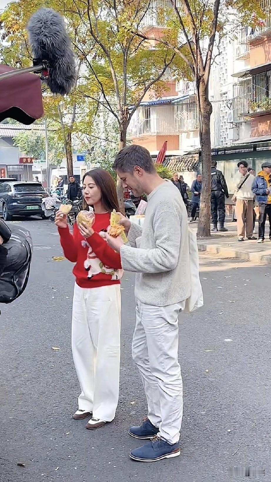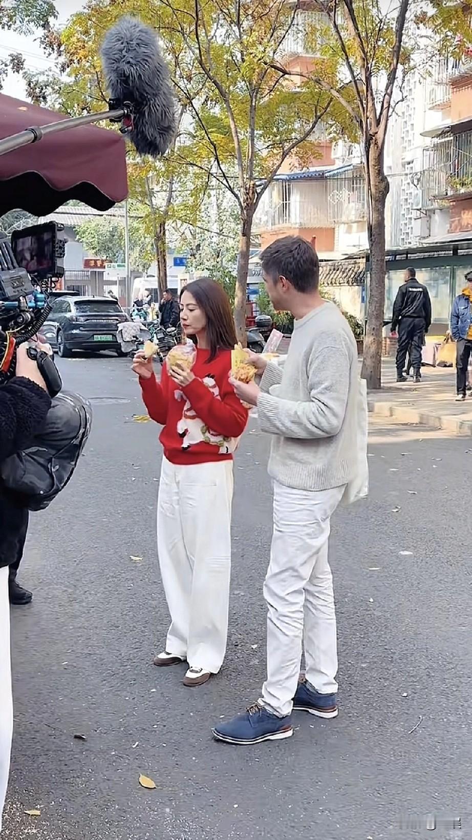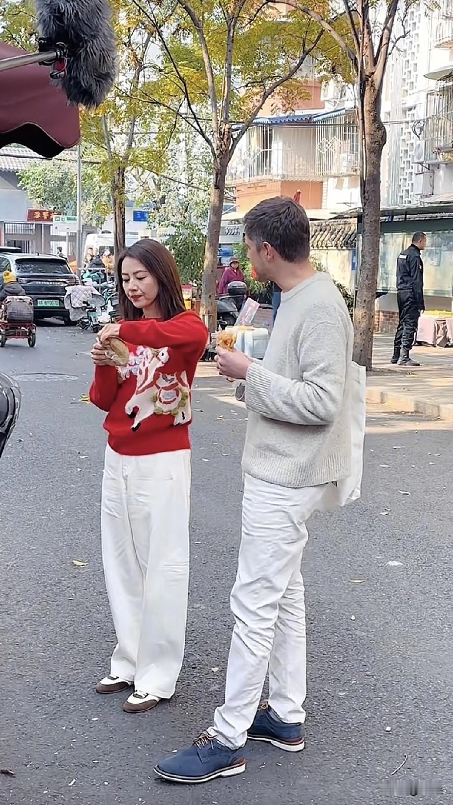 在成都玉林综合市场的街头,高圆圆身着红色毛衣搭配白色阔腿裤,和身旁的友人一同品尝着美食,阳光透过树枝洒下,街道的烟火气