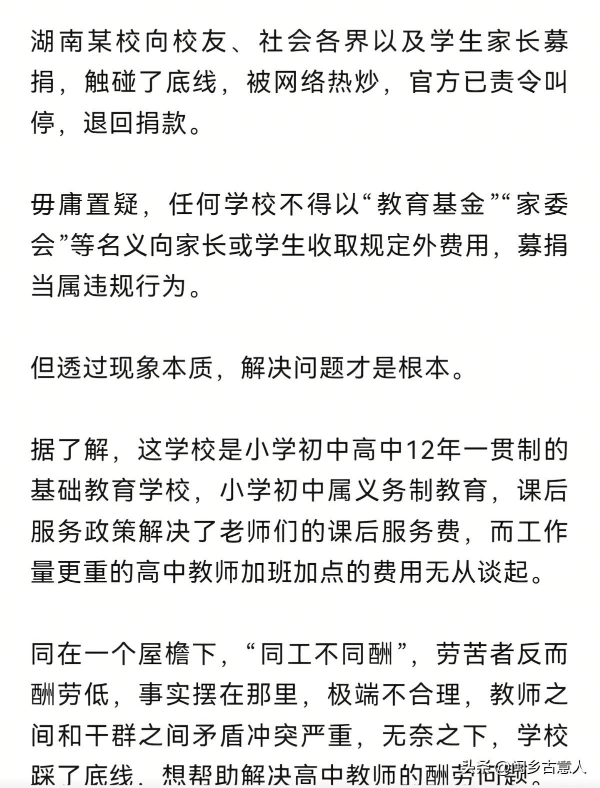 某高中家委会,要家长至少捐1000块钱的真相,作为一个学生家长我是很赞同的 刚看到网上曝光出来的聊天记录,我还以为是家委会为了讨好老师,才会出现这么一个离谱的通知。 等我翻看了其他的相关信息,才知道原来这是补课费! 相对于校外补课费,这一千块钱已经是很低了,我小孩读初一,课外每周上2小时,都要200块钱,高中价格更贵!并且本校老师的补课质量很明显会优于校外。 至于为什么不直接说是补课费,原因也简单,补课是不允许的不能公开的!