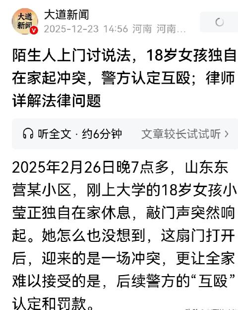 山东东营,18岁的女孩,独自在家被陌生人敲门,门打开后,对方称自己的儿子被女孩的弟弟打了,双方言语不合动了手,对方的体重大,女孩被按在地上打。经鉴定,女孩为轻微伤,然而,让全家难以接受的是,女孩被警方认定互殴并罚款,原因是女孩无法证明自己没动手,女孩家人觉得,就算女孩动手,也应是正当防卫。他们质疑,对方是4人相互印证,这样的证据,能完全采信吗?   18岁的女孩小孙(化名)原本只是度过一个再普通不过的晚上,母亲孙女士因工作需要出差在外,家中只剩小孙一人,她在客厅看电视时,突然听到敲门声。   透过门镜,她看到一名陌生人,对方神情急躁,出于警惕,小孙隔着门询问来意,对方称“小孙的弟弟把她儿子打了”,要求进屋说清楚,小孙解释弟弟并不在家,但对方情绪激动,话语中夹杂着指责与威胁。   在小孙尚未反应过来时,陌生人趁她开门的一瞬间强行闯入屋内,狭小的客厅里,争执迅速升级,对方体型高大,不断逼近,小孙感到明显恐惧,试图后退并让对方离开,但对方并未停止。   随后,肢体冲突发生,由于力量悬殊,小孙很快被按倒在地,多次遭到殴打,邻居听到动静报警,冲突才得以结束。   事后,小孙被送往医院,经鉴定为轻微伤,按理说,作为被陌生人闯入住宅的一方,小孙理应得到保护,然而警方调查后却认定双方构成“互殴”,并对小孙作出处罚,理由是,现场缺乏有效证据证明小孙未还手,而她本人也无法提供监控或第三方证言,证明自己完全处于防卫状态。   这一结果令全家难以承受,孙女士觉得,陌生人非法闯入住宅,已然构成严重侵权。在此情形下,小孙遭受攻击时即便存在反抗举动,也应属于正当防卫,而非互殴,更何况,小孙在体力、年龄和性别上都明显处于弱势,不可能主动挑衅或寻求冲突。   事件被曝光到网络后,引发大量讨论,许多网友质疑认定标准过于机械,认为“无法自证清白”不应成为受害者被处罚的理由,也有人指出,正当防卫在实践中往往面临举证困难,尤其是家庭空间内的突发冲突,更容易让受害者陷入“还手即有错”的困境。   这起事件不仅是一名女孩的遭遇,更折射出公众对安全感与公平感的深层焦虑,对普通人而言,面对突如其来的侵害,如何自保、如何被法律正确理解,仍然需要更清晰、更人性化的答案。 信息来源 :大道新闻