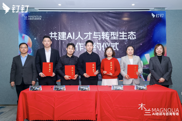 (图:钉钉与北大培文国际教育研究院、超级太乙、恩久科技、华夏基石签署共建AI人才与转型生态合作协议。)